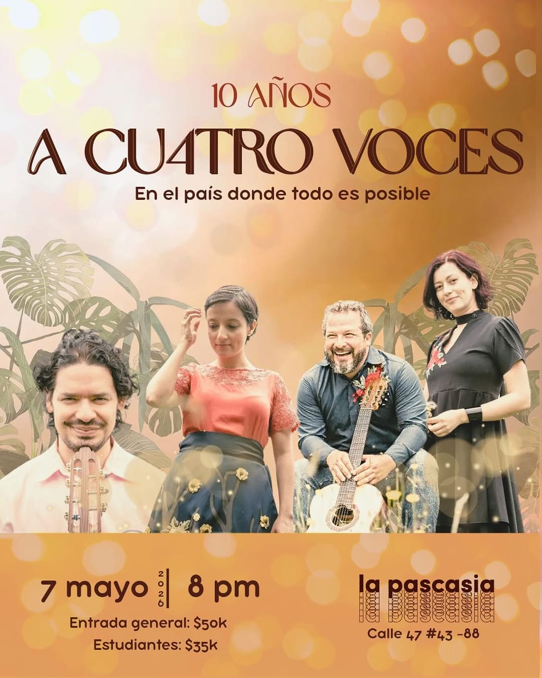 10 AÑOS A CUATRO VOCES es un concierto íntimo en La Pascasia, en Medellín, que celebra una década de historia musical compartida entre voces, cuerdas y encuentros. Será una velada especial con invitados que han acompañado este proceso creativo, ideal para quienes disfrutan de propuestas musicales cuidadas y cercanas. Un espacio perfecto para conectarse con la trayectoria del proyecto y vivir una experiencia sonora emotiva y cercana.