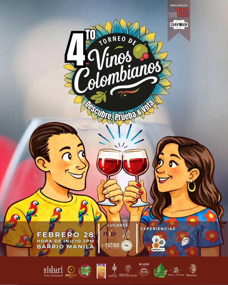 El 4to Torneo de Vinos Colombianos reúne a amantes del vino para descubrir, probar y votar por etiquetas nacionales en una experiencia de degustación guiada en el barrio Manila, en Medellín. Organizado por Biernes, este torneo de vinos colombianos ofrece un recorrido por diversas bodegas del país, ideal para quienes quieren explorar nuevos sabores, apoyar la producción local y vivir una tarde dedicada a la cultura del vino.