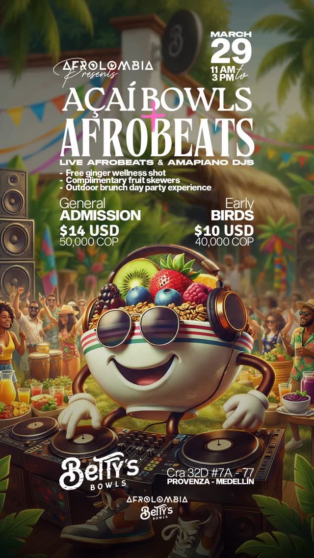AÇAÍ Bowls Afrobeats es una brunch day party dominical en Betty’s Bowls, en Provenza, Medellín, que combina sabores frescos con ritmos de Afrobeats y Amapiano. Durante la Ciclovía, los asistentes disfrutan un ambiente al aire libre con DJs en vivo, smoothies, brunch, shots de jengibre y brochetas de fruta. Es un plan ideal para rodar en bici, recargar energía y seguir la fiesta en un espacio relajado y lleno de buena vibra.