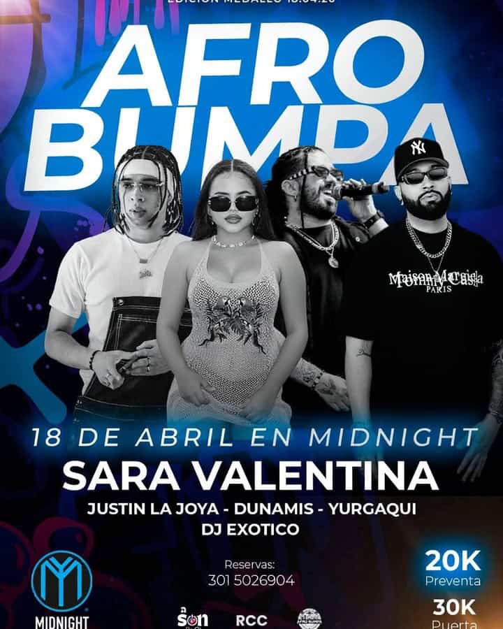 AFRO BUMBA llega a Medellín con su edición Midnight Medellín, una fiesta urbana enfocada en el perreo y los ritmos latinos. Este DJ set / clubbing reúne a Justin La Joya, Yurgaqui, Dunamis, Sara Valentina y DJ Exotico para una noche intensa de reggaetón y sonidos urbanos. Midnight Medellín promete una experiencia de rumba continua, con enfoque en la cultura urbana y el perreo en la ciudad.