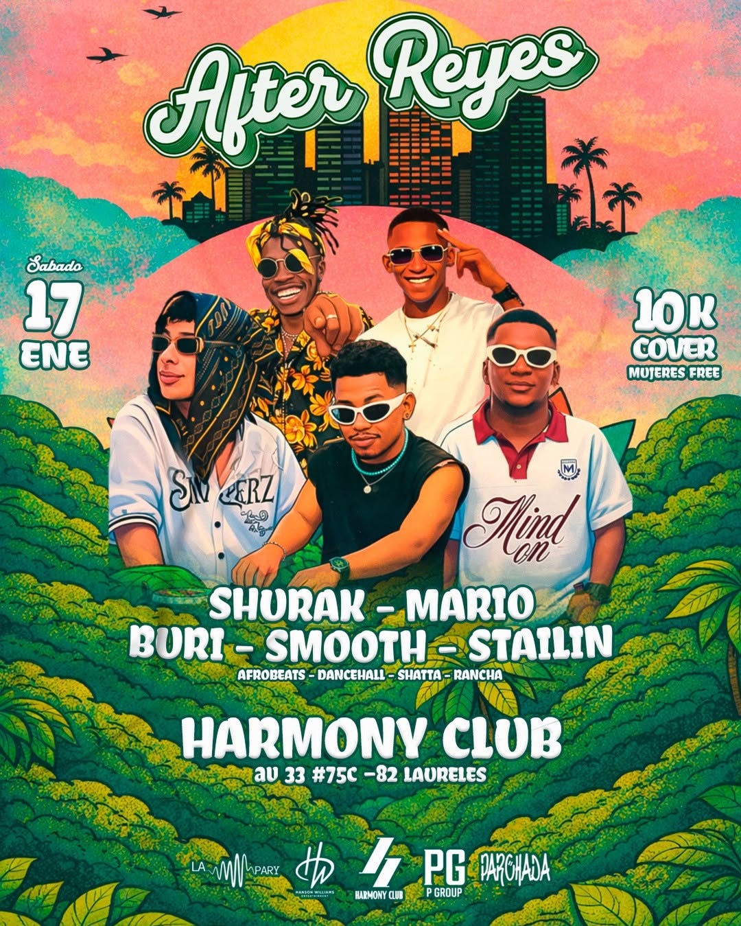 Inicia el año con el mejor ritmo en Medellín. El After Reyes en Harmony Club te invita a disfrutar de una selecta musical con géneros como Afrobeats, Dancehall, Shatta y Rancha. No te pierdas esta noche llena de música y diversión con los artistas Shurak, Mario, Buri, Smooth y Stalin. ¡Te esperamos en Laureles para vivir una experiencia inolvidable!