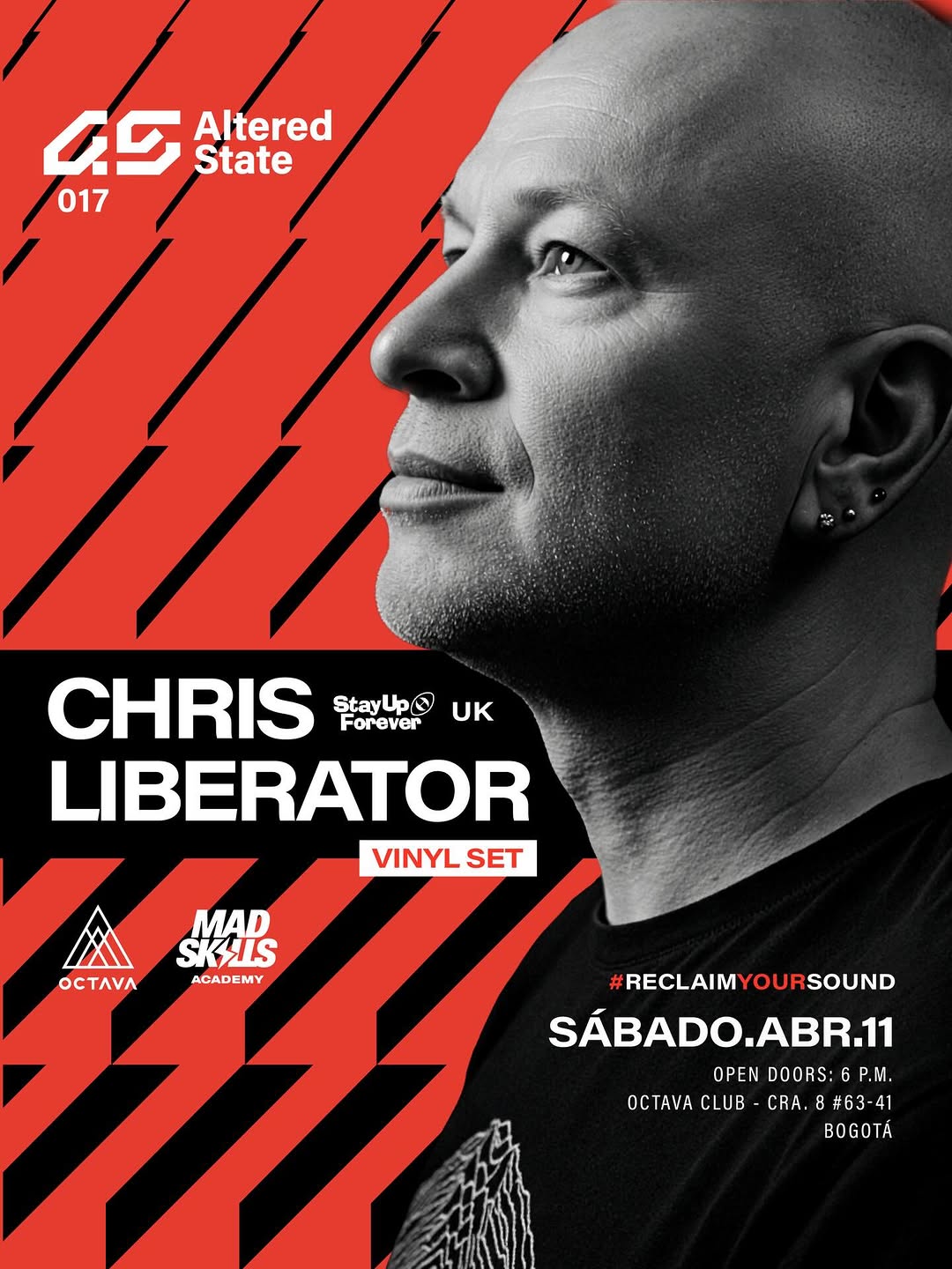 Altered State 017 es una noche especial de DJ set y clubbing en Bogotá, dedicada al sonido ácido en vinilo. El legendario Chris Liberator, figura clave del London Acid Techno, presentará un set 100% en vinilo, crudo y directo. Además, se realizará la graduación oficial de estudiantes de DJ y VJ de Mad Skills Academy, quienes mostrarán su trabajo en un contexto real de club, con un ambiente intenso, formativo y underground.
