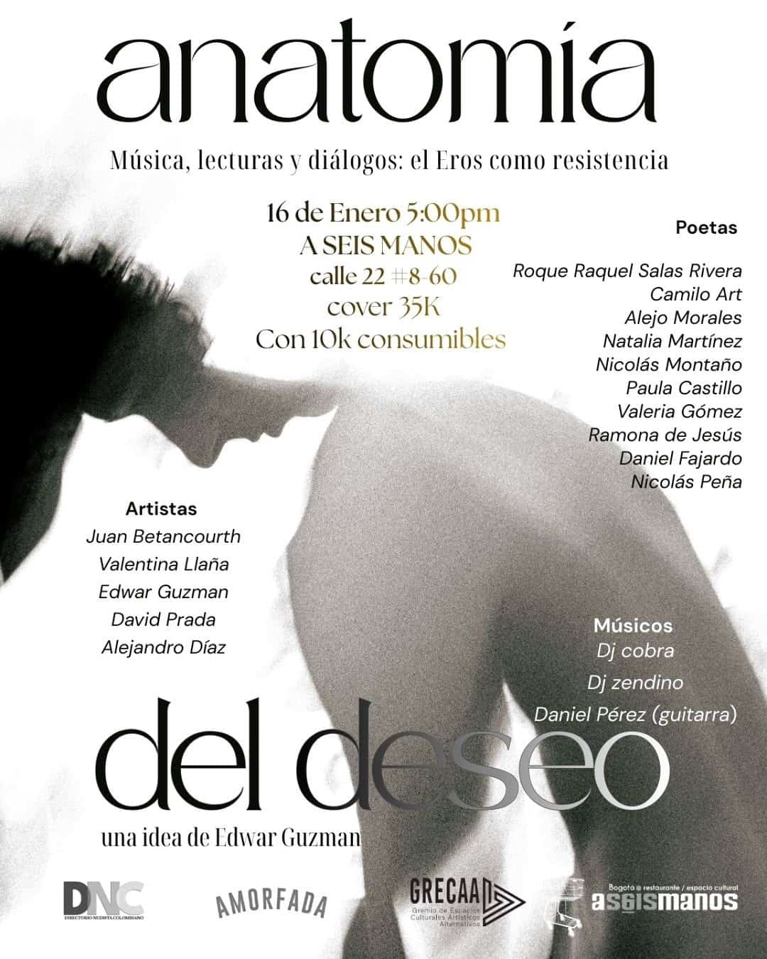 Anatomía del deseo es un evento cultural multidisciplinario que se llevará a cabo en Bogotá, en el espacio cultural A Seis Manos. Este evento explorará el erotismo y el cuerpo a través de la poesía, la música y la fotografía. Contará con la participación de poetas nacionales e internacionales, artistas plásticos, performers y músicos. La noche culminará con un DJ Set diseñado para la catarsis, con sonidos sensuales y potentes que invitan a celebrar la libertad del movimiento y la comunión de los cuerpos.