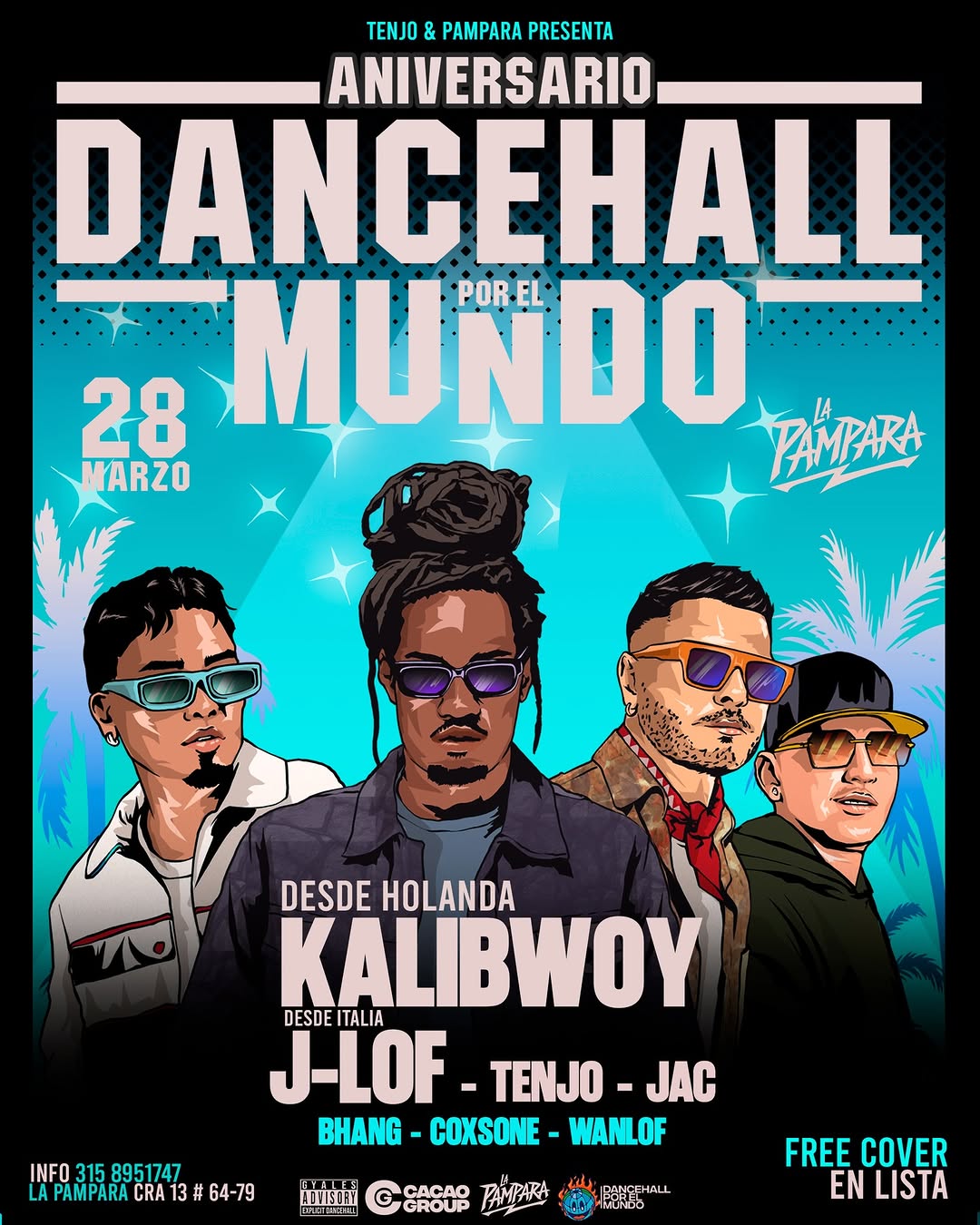 Aniversario Dancehall por el Mundo es una fiesta de dancehall que celebra este género con invitados internacionales y talento local en La Pampara. En este evento se presentan artistas como Kalibwoy y J-Lof junto a Tenjo y otros exponentes, creando una noche de baile intenso y energía caribeña ideal para amantes del dancehall en Colombia. Una experiencia perfecta para disfrutar música en vivo y cultura urbana.
