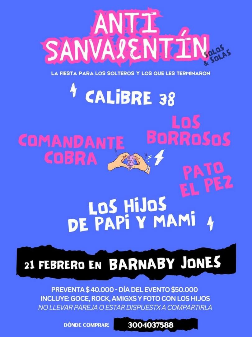 Imagina una noche donde el desamor se convierte en celebración, donde el rock resuena con fuerza y la diversión es la única protagonista. El Anti San Valentín trae consigo una explosión de energía en un evento que promete despecho y alegría a raudales. Con las vibrantes actuaciones de Calibre 38, Los Borrosos, Comandante Cobra, Pato el Pez y Los Hijos de Papi y Mami, la música te hará olvidar cualquier romanticismo. Ya sea que vengas solo, en grupo o con alguien que comparta tu espíritu festivo, este es el lugar ideal para disfrutar de una velada inolvidable el 21 de febrero de 2026.