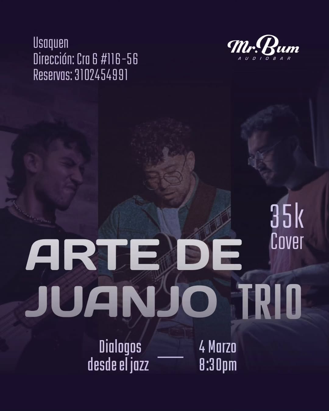 ARTE DE JUANJO TRIO es un concierto íntimo de diálogos desde el jazz en Mr. Bum Audiobar, donde el trío de Juanjo explora composiciones originales y la interacción en tiempo real. En este evento en Usaquén, Bogotá, la melodía y las texturas son protagonistas, con espacios de silencio y respiración musical que crean una experiencia cercana, sensible y profundamente expresiva para amantes del jazz contemporáneo.