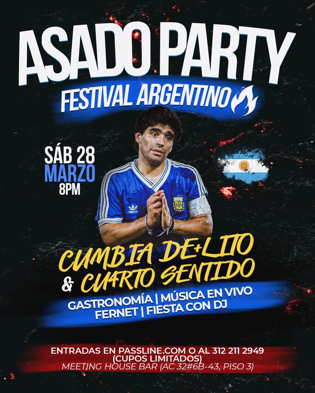 ASADO PARTY – Festival Argentino es una noche para vivir la cultura argentina en Bogotá con música en vivo, DJ y mucha fiesta. En Meeting House se presentarán Cumbia Delito y Cuarto Sentido, acompañados de gastronomía típica, asado y fernet para crear una experiencia auténtica y festiva. Un plan ideal para quienes buscan un evento con sabor argentino, buena rumba y ambiente relajado en la ciudad.