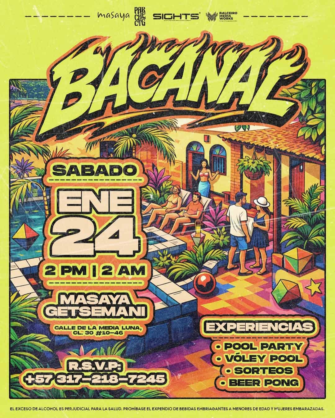 BACANAL es una fiesta llena de ritmo y cultura que se llevará a cabo en el Massaya Hostel Getsemaní en Cartagena. Este evento promete una experiencia única con actividades como pool party, vóley pool, sorteos y beer pong. Además, contará con la presencia de @elmajjoma en un Stream Live. Es una oportunidad perfecta para mezclarse con viajeros, locales y la escena creativa de la ciudad. ¡No te lo pierdas!