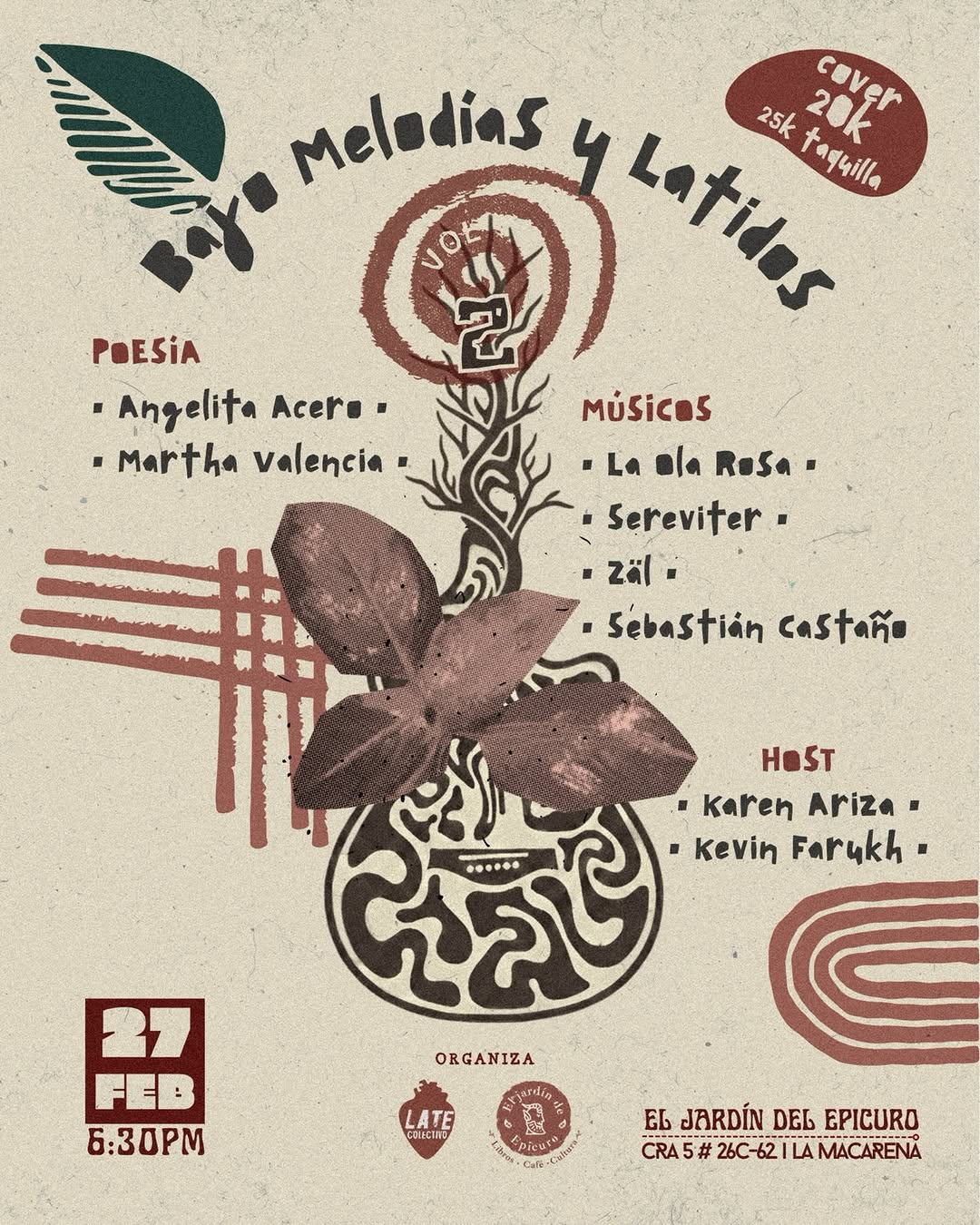 “Bajo melodías y latidos Vol. 2” es un encuentro íntimo en Bogotá que combina música en vivo y poesía, con la participación de varios artistas invitados en El Jardín de Epicuro Librería. Será una noche para disfrutar de letras, sonidos y sensibilidad artística, ideal para quienes buscan planes culturales en Bogotá y quieren conectarse con nuevas propuestas de música y poesía en un ambiente cercano y acogedor.