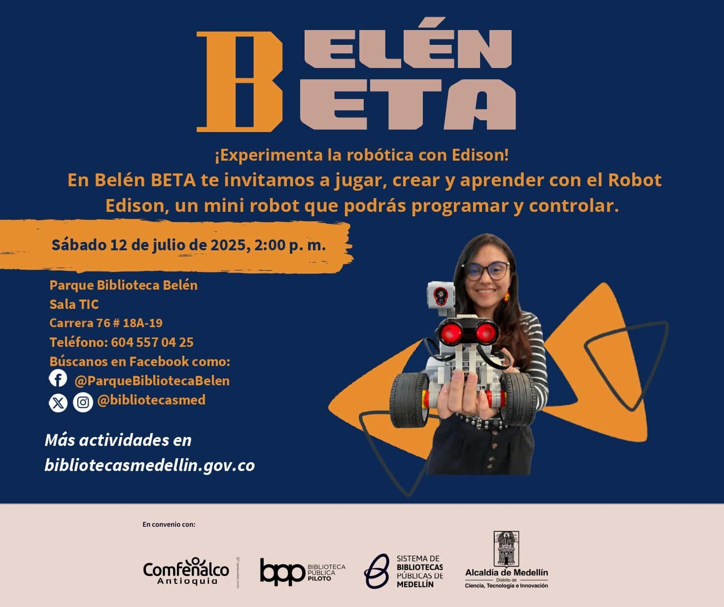 Acompáñanos este sábado 12 de julio a las 2:00 p.m. en la sala virtual del Parque Biblioteca Belén y descubre de forma dinámica y súper chévere cómo funciona Edison, un robot diseñado para aprender, explorar y jugar.