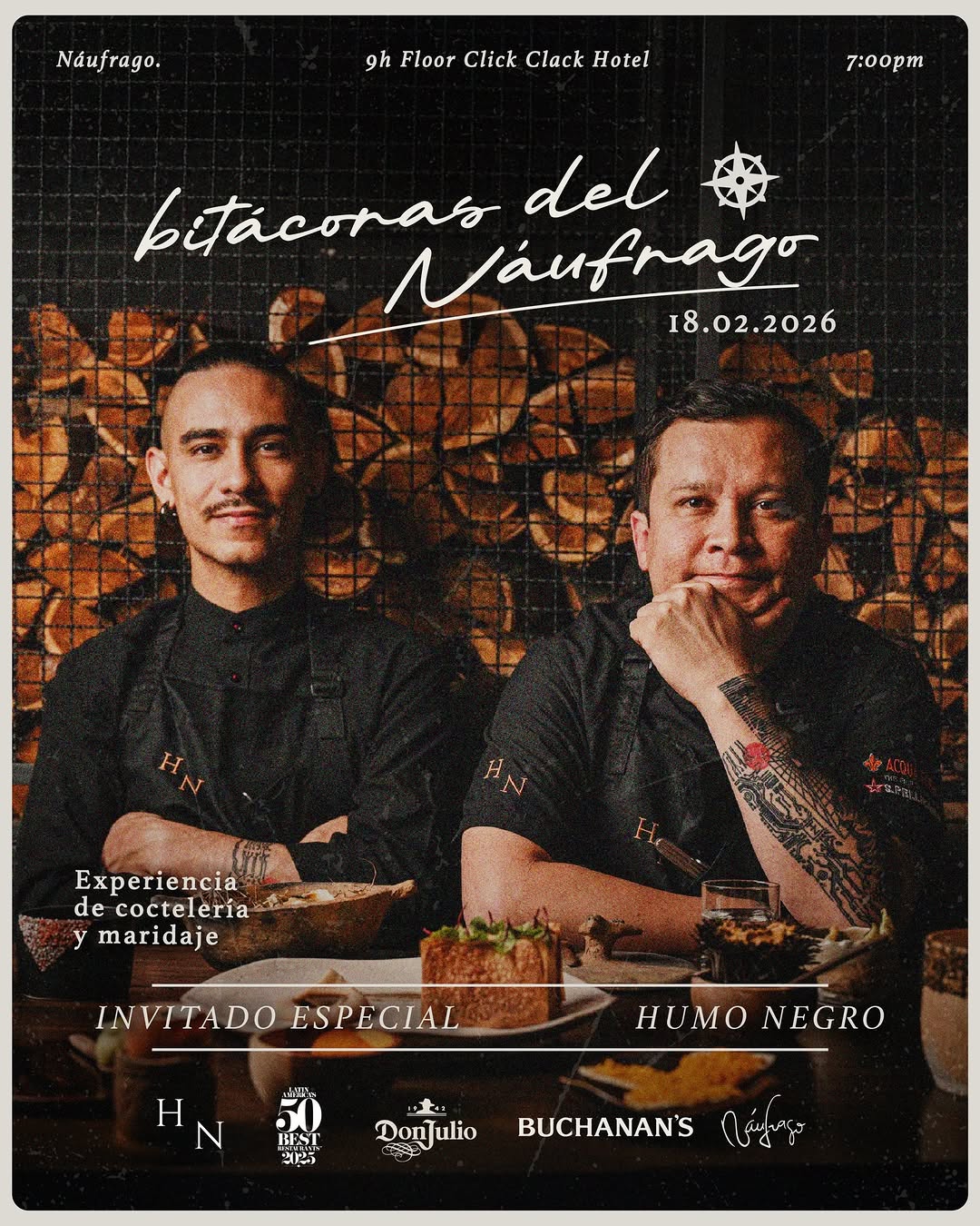 Bitácoras del Náufrago es una experiencia de coctelería y maridaje en el 9h Floor del Click Clack Hotel, donde Humo Negro presenta una propuesta sensorial única en la ciudad. Este evento de mixología invita a explorar sabores, texturas y aromas en un formato íntimo y cuidado, ideal para amantes de la gastronomía líquida que buscan una noche diferente, creativa y sofisticada en un ambiente diseñado para disfrutar y descubrir nuevos rituales alrededor del cóctel.