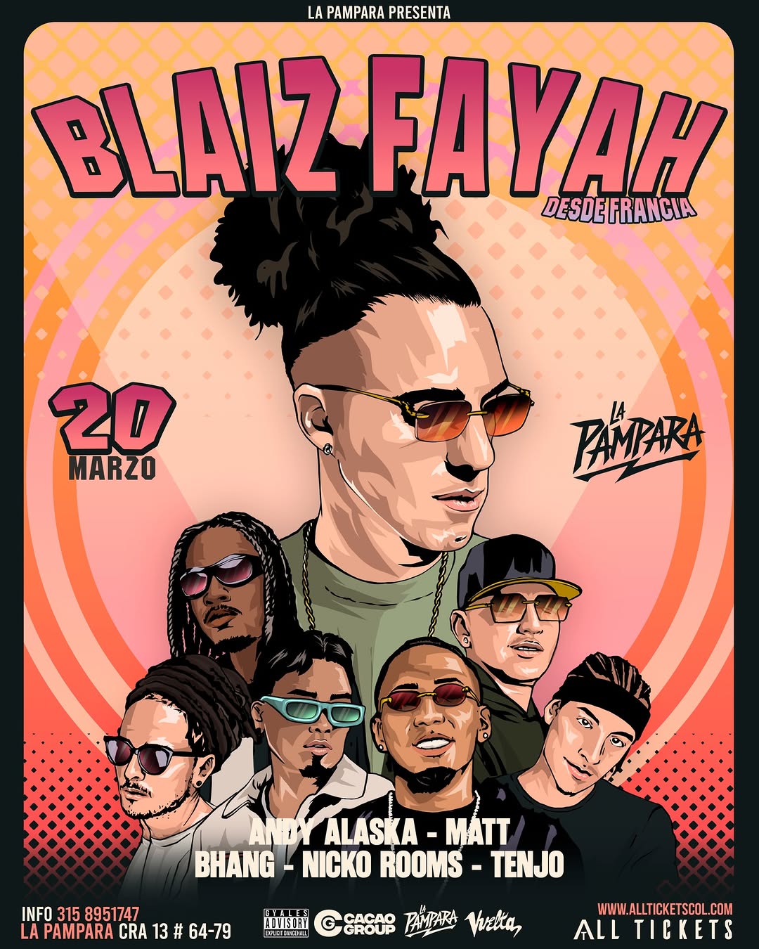BLAIZ FAYAH es una noche de dancehall y shatta en vivo en La Pampara Bar, en Bogotá. El artista francés Blaiz Fayah llega como invitado internacional junto a un line up local con Andy Alaska, Matt Bhang, Nicko Rooms y Tenjo. Será una fiesta urbana intensa, enfocada en el baile, la energía del público y la conexión entre la escena europea y latinoamericana.