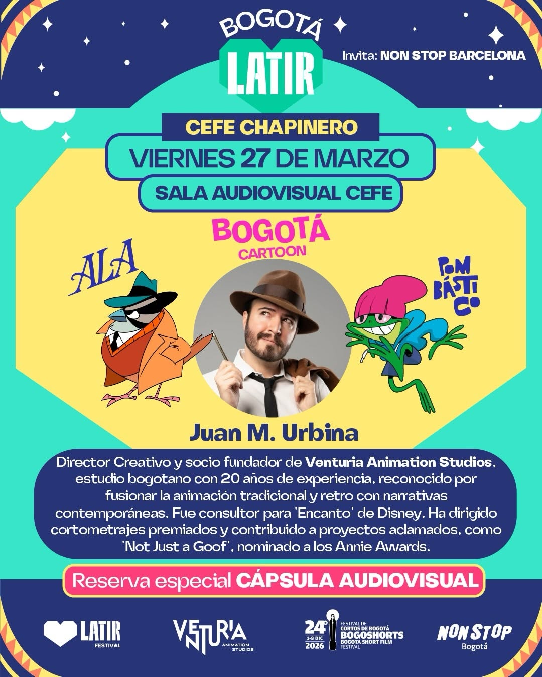 La Cápsula Audiovisual LATIR es una charla profesional del Latir Festival Bogotá con Juan M. Urbina, fundador de Venturia Animation Studios, en la Sala Audiovisual de CEFE Chapinero en Bogotá. Este encuentro se centra en animación, creación de personajes y desarrollo de universos visuales, con énfasis en la experiencia de Urbina en proyectos internacionales como Encanto y Not Just a Goof. Un espacio ideal para quienes buscan inspiración y guía para construir una carrera en la industria de la animación.