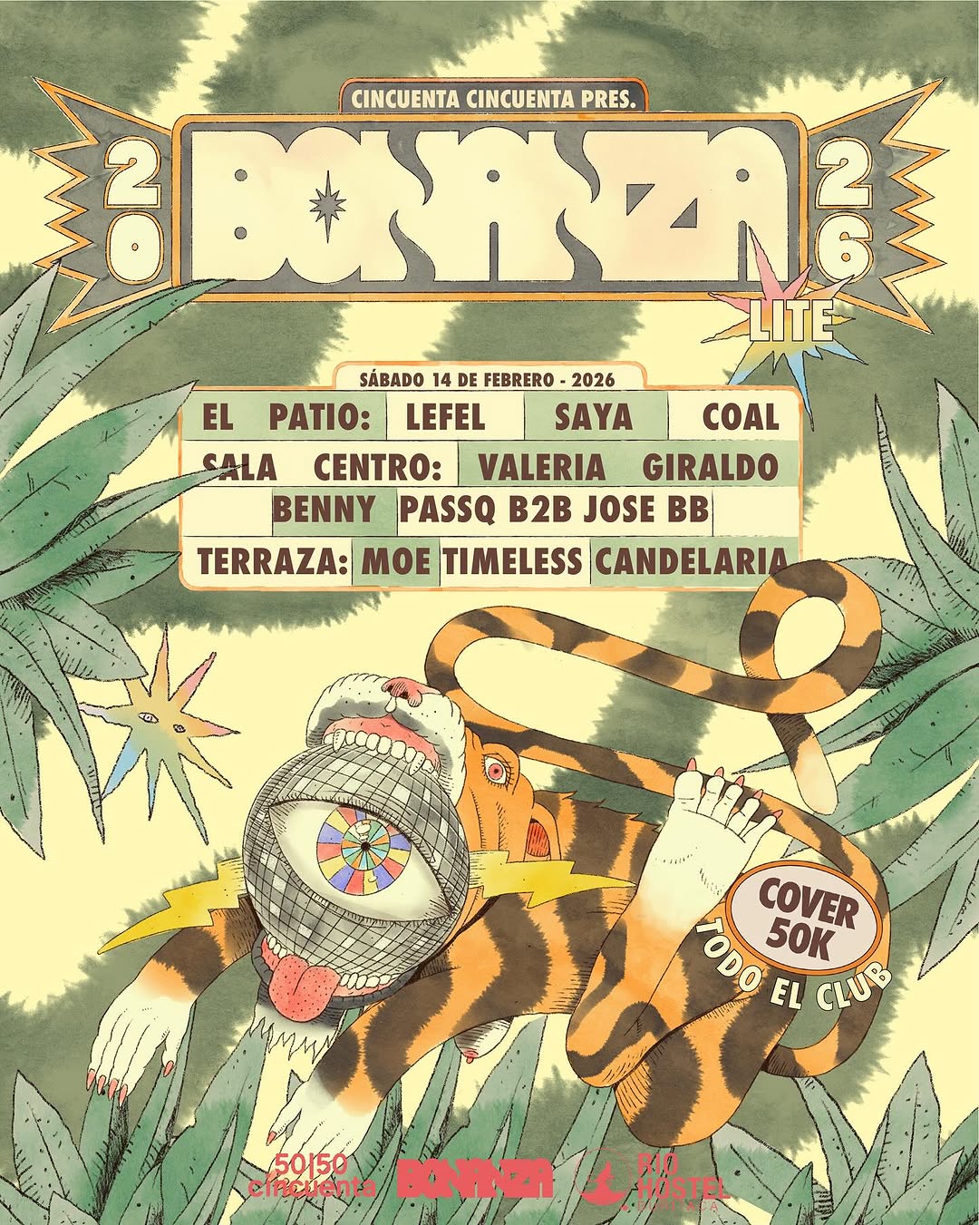 BONANZA LITE 2026 llega a CINCUENTA CINCUENTA en Medellín como un evento musical de club que toma todo el espacio con varias áreas activas y una alineación amplia de DJs. El Patio, la Sala Centro y la Terraza tendrán propuestas sonoras distintas con artistas como Lefel, Saya, Coal, Valeria Giraldo, Benny, Passo b2b Jose BB, Moe, Timeless y Candelaria, creando una noche intensa de fiesta electrónica ideal para quienes buscan una experiencia de clubbing completa en la ciudad.