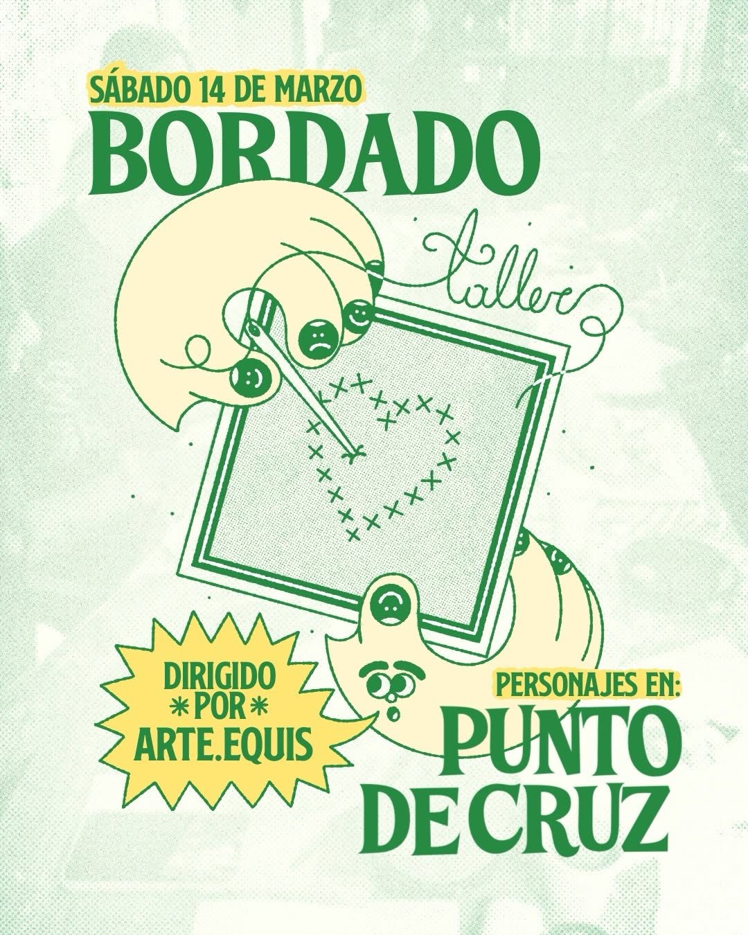 BORDADO Taller es un espacio creativo en Bogotá para aprender punto de cruz desde cero junto a la artista Arte.equis en YANG coffee & tattoos. Durante la sesión se exploran puntadas básicas, se diseña un personaje personalizado y se recibe un kit con todos los materiales, además de bebida caliente y postre. Es un taller cultural ideal para quienes quieren iniciarse en el bordado en un ambiente cercano y relajado.