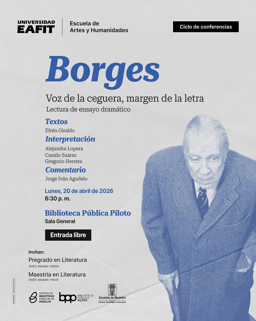 “Borges – Voz de la ceguera, margen de la letra” es el tercer encuentro del ciclo sobre Borges en Medellín, una conferencia dramática donde se exploran sus facetas como prologuista, profesor, intelectual y figura mediática. En la Sala General de la Biblioteca Pública Piloto, voces como Efrén Giraldo, Alejandra Lopera, Camilo Suárez, Gregorio Herrera y Jorge Iván Agudelo dialogan con la obra del autor argentino en una experiencia literaria y ensayística organizada por la Escuela de Artes y Humanidades de la Universidad EAFIT.