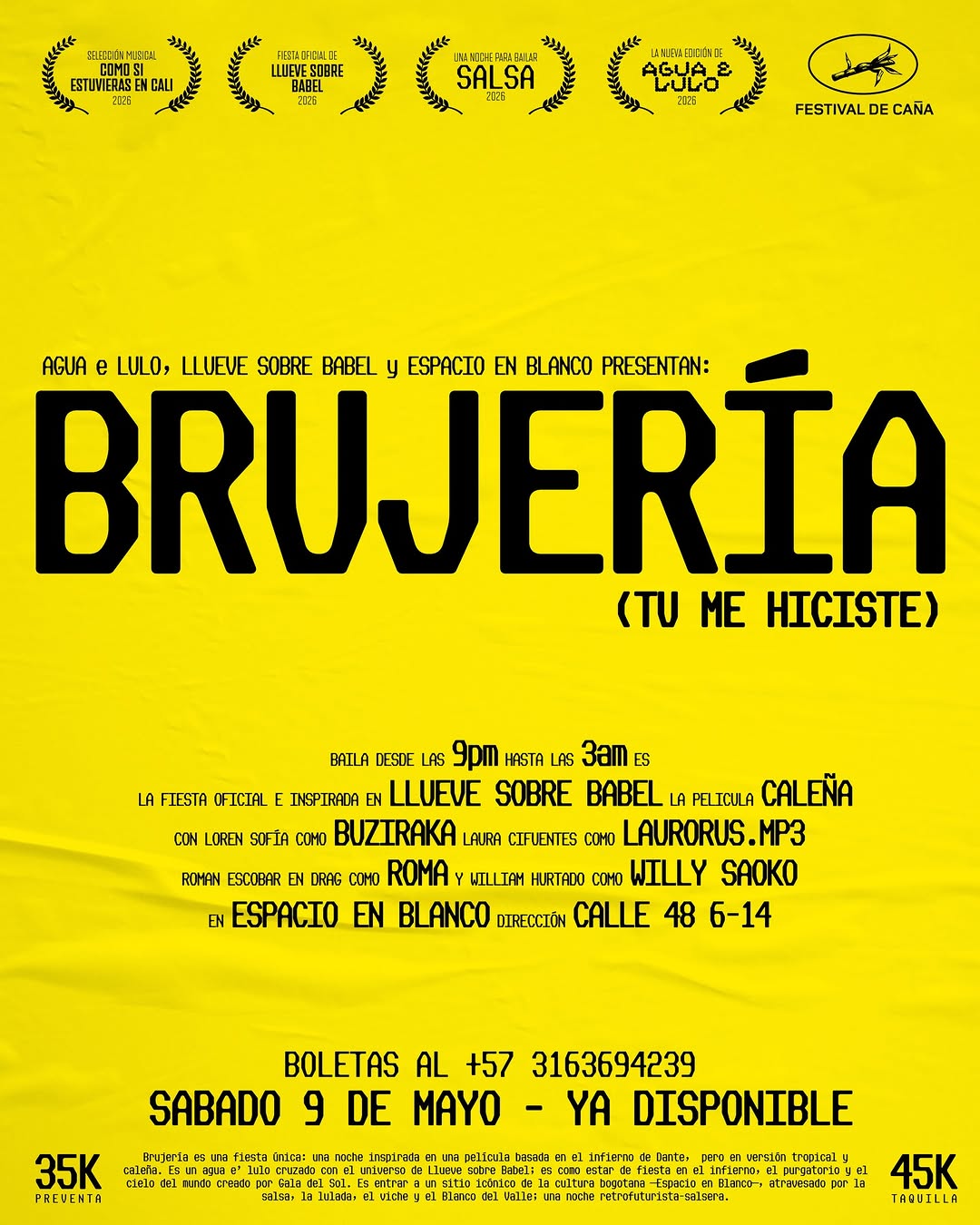 BRUJERÍA (TU ME HICISTE) es la fiesta oficial inspirada en la película caleña Llueve sobre Babel, que llega a Espacio en Blanco en Bogotá como un plan perfecto para quienes aman el baile y la estética retro-futurista tropical. Con la presencia de Buziraka, Laurorus.mp3, Roma y Willy Saoko, este evento promete una noche intensa de música, performance y energía caleñísima, ideal para sumergirse en un universo cinematográfico y fiestero único en la ciudad.
