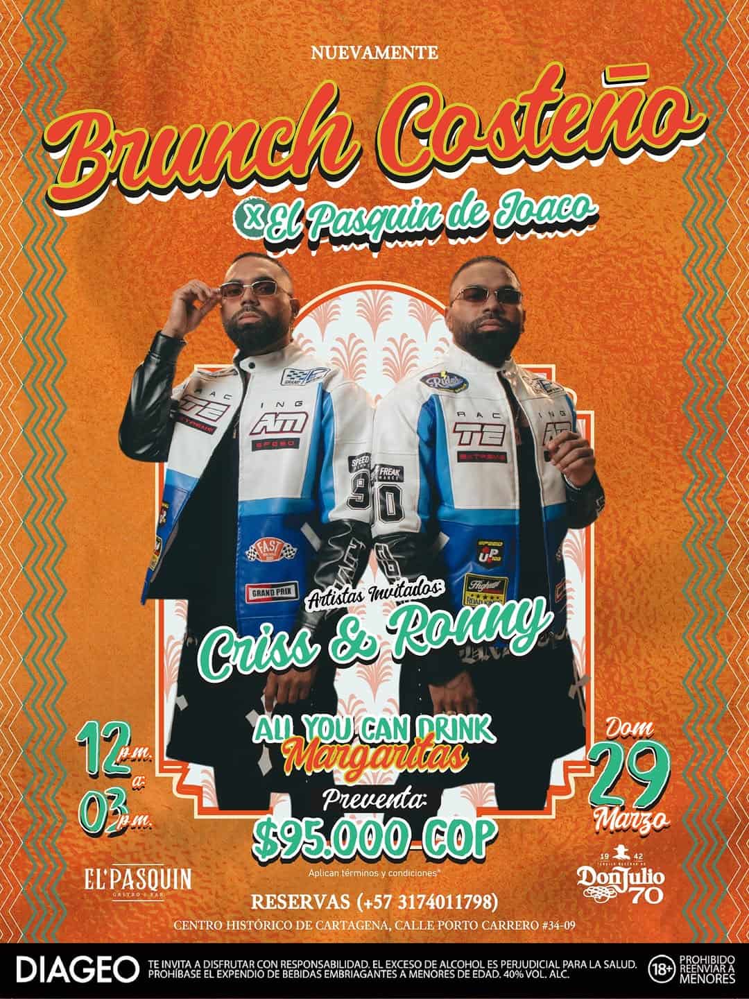 Costeños Brunch regresa a El Pasquín de Joaco en Cartagena como un brunch costeño lleno de sabor, música y buen parche. Disfruta un plan de brunch con ambiente playero, margaritas ilimitadas y el show en vivo de Crissy Ronny, ideal para arrancar la tarde con amigos. Un evento perfecto para quienes buscan un brunch diferente, con flow caribeño y mucha fiesta en el Centro Histórico.