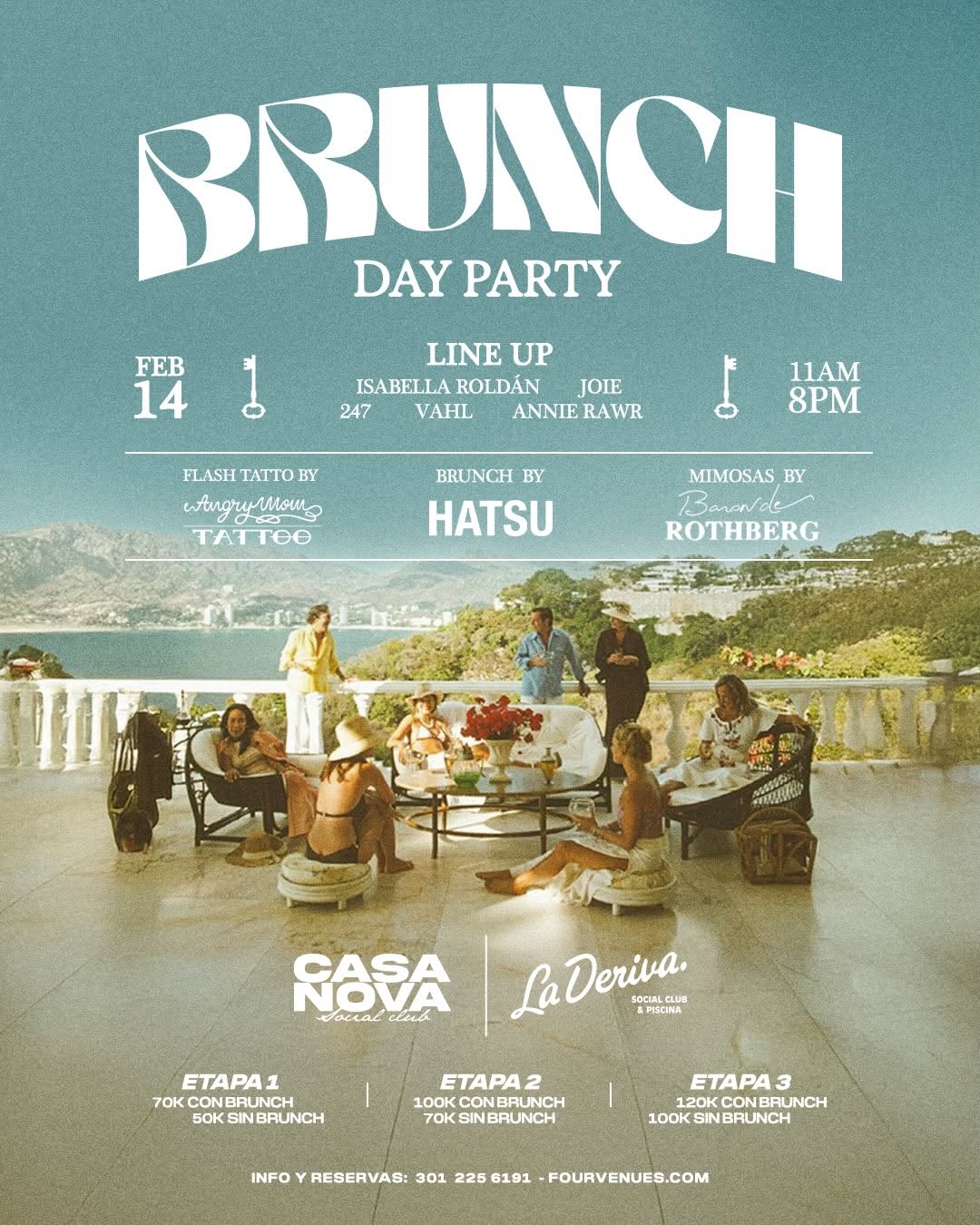BRUNCH DAY PARTY es una day party tipo brunch en La Deriva Social Club, ideal para quienes quieren celebrar con buena música y ambiente relajado en la ciudad. El evento reúne a Isabella Boldán, 247, Vahl, Joie y Annie Rawr en una jornada con brunch, mimosas y espacio para disfrutar entre amigos, además de experiencias como flash tattoo que le dan un toque diferente a este plan diurno.