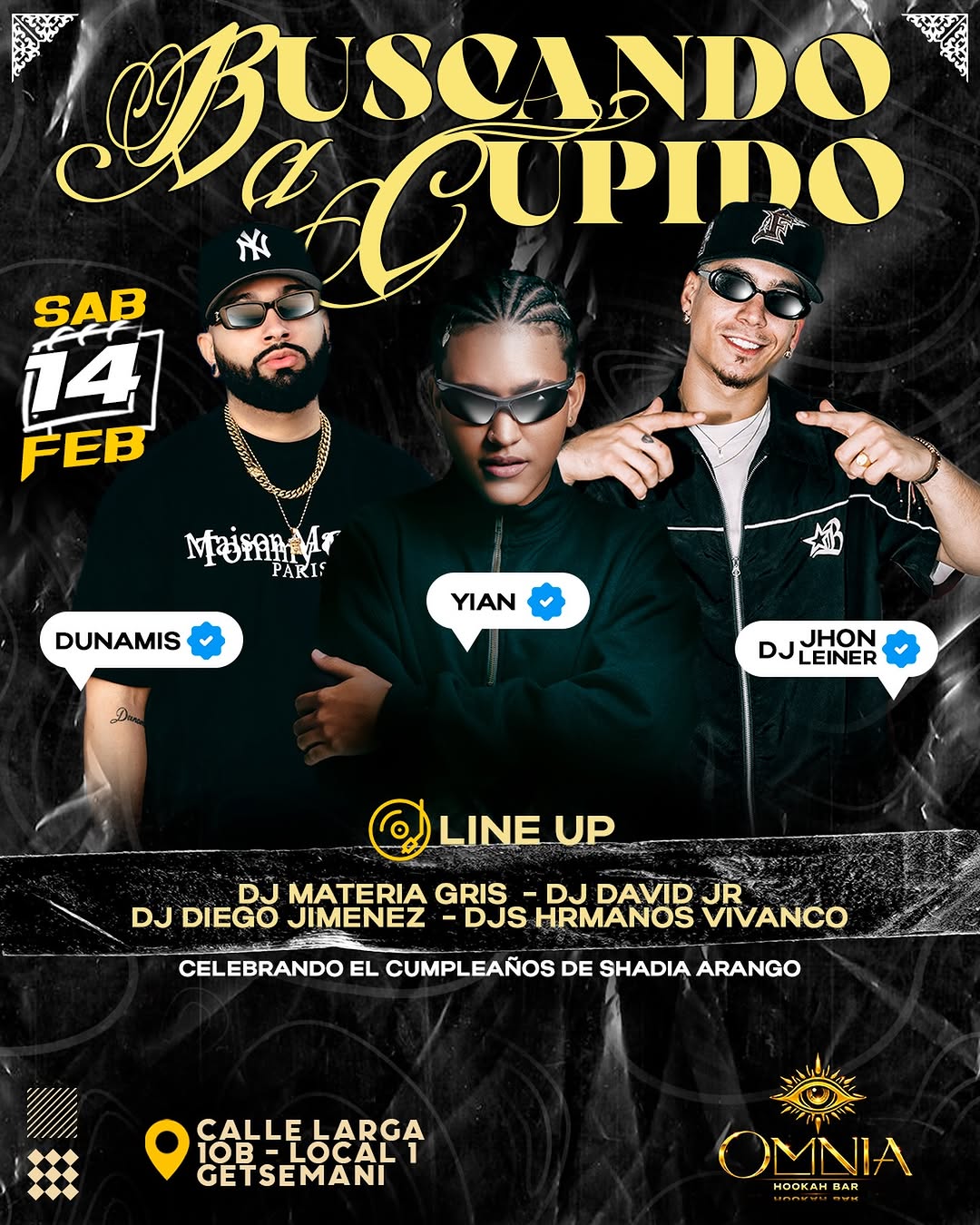 Buscando a Cupido es una fiesta especial en OMNIA Hookah Bar en Cartagena, organizada por Maison De Paris para celebrar el cumpleaños de Shadia Arango. Será una noche de celebración con enfoque en música electrónica y urbana a cargo de DUNAMIS, YIAN y varios DJs invitados, creando un ambiente festivo e íntimo ideal para disfrutar en pareja o con amigos en la ciudad.