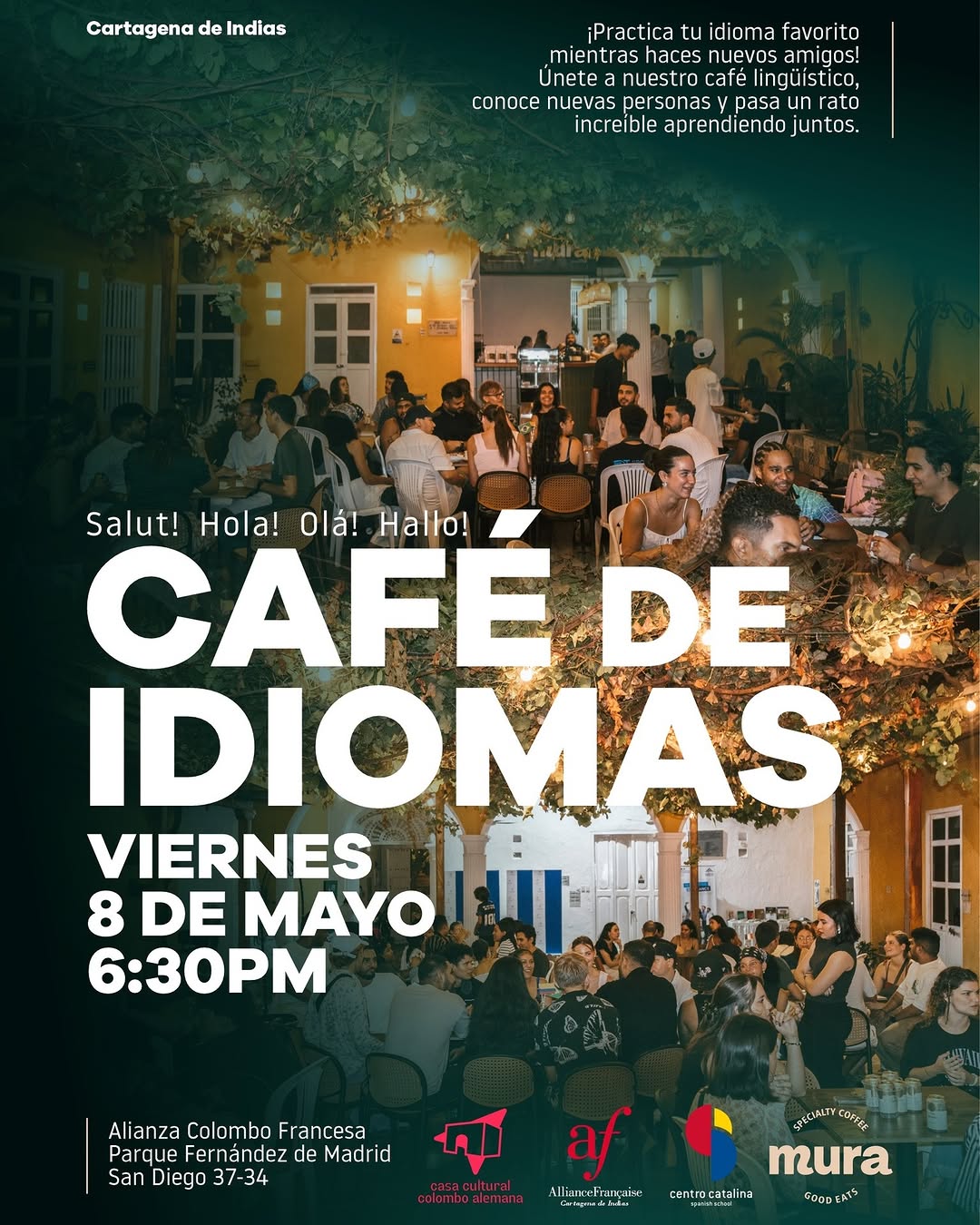 Café de Idiomas es un encuentro de intercambio de idiomas en la Alianza Colombo Francesa de Cartagena, ideal para practicar tu lengua favorita en un ambiente relajado y multicultural. Es una actividad tipo café lingüístico donde podrás conversar, hacer nuevos amigos y mejorar tus habilidades comunicativas sin importar tu nivel. Un plan perfecto en Cartagena para quienes disfrutan aprender idiomas de forma informal y divertida.