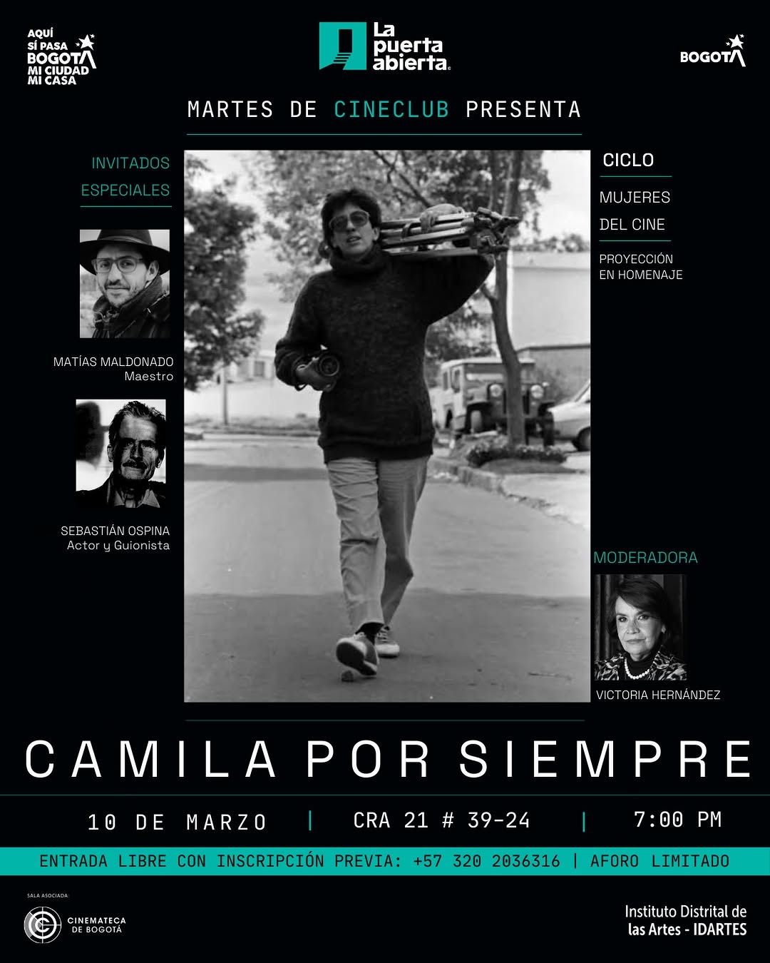 Camila por Siempre es un martes de cineclub en Bogotá dedicado a los cortos de la directora colombiana Camila Lobo Guerrero, dentro del ciclo Mujeres del Cine en La Puerta Abierta. La actividad combina proyección y conversatorio con Matías Maldonado y Sebastián Ospina, moderado por Victoria Hernández, para explorar su mirada íntima y poética sobre la vida cotidiana, la memoria histórica y las tensiones sociales. Un espacio ideal para amantes del cine colombiano y la reflexión audiovisual.