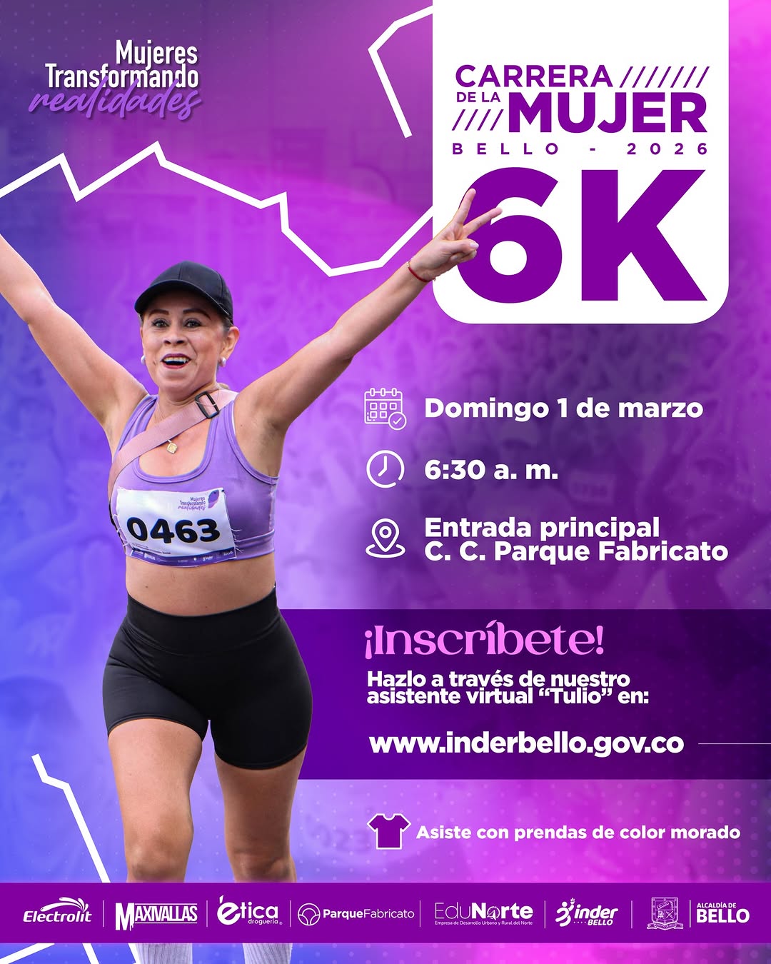 La Carrera de la Mujer Bello 2026 6K es una actividad deportiva pensada para resaltar la fuerza y unión de las mujeres en Bello. Será una carrera recreativa donde puedes correr, trotar o caminar, promoviendo el deporte y la transformación de realidades. Organizada por la Alcaldía de Bello y el INDER Bello, invita a asistir con prendas moradas para vivir una experiencia colectiva de bienestar y empoderamiento femenino en la ciudad.