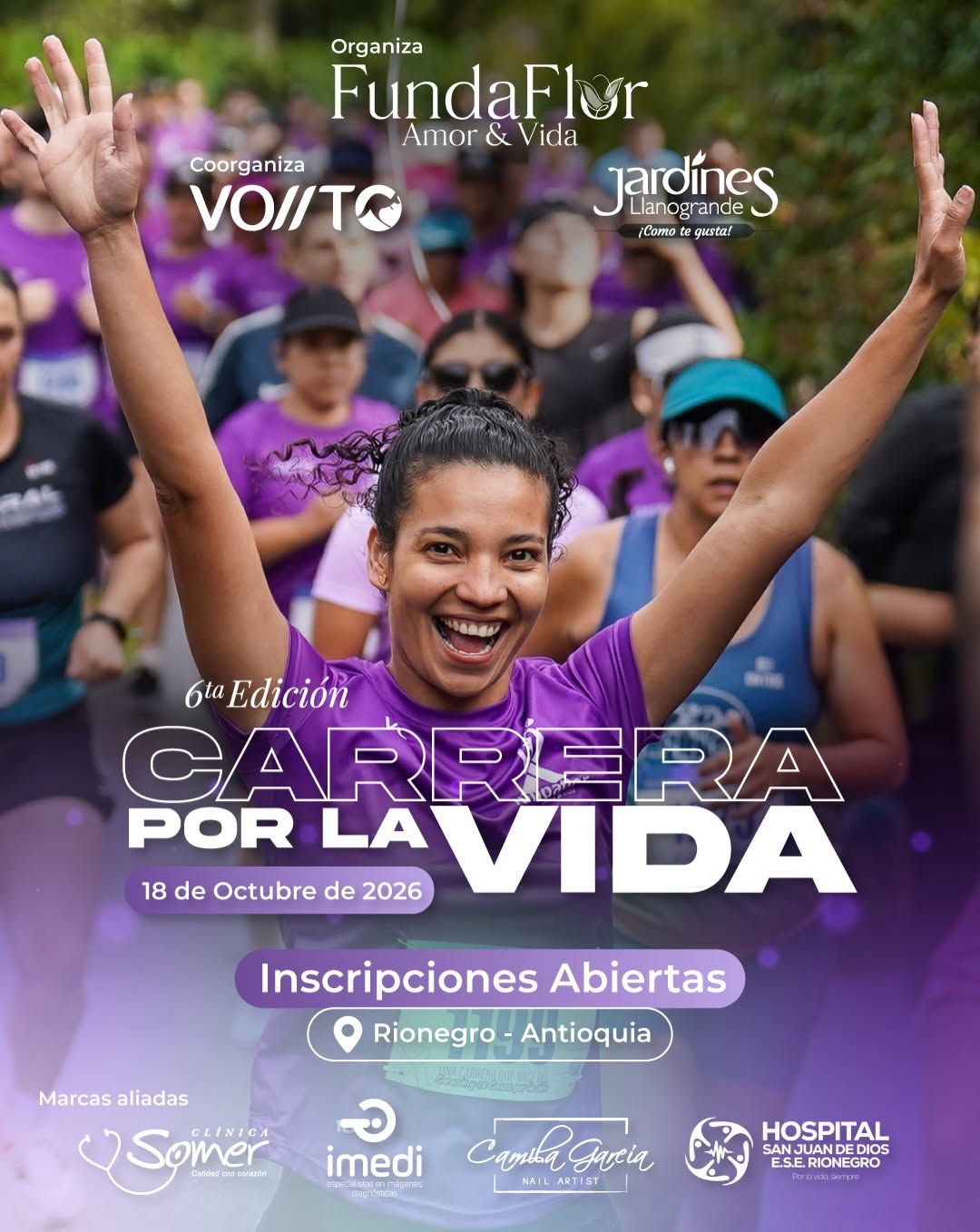 La 6ta Carrera por la Vida es una carrera atlética organizada por FundaFlor Amor & Vida en Rionegro, Antioquia, pensada para correr con las personas que llevamos en el corazón. Esta actividad deportiva y solidaria invita a participar en familia o con amigos, honrando la vida y el cuidado de quienes amamos. La Carrera por la Vida combina deporte, bienestar y propósito social en un evento emotivo y significativo en Rionegro.