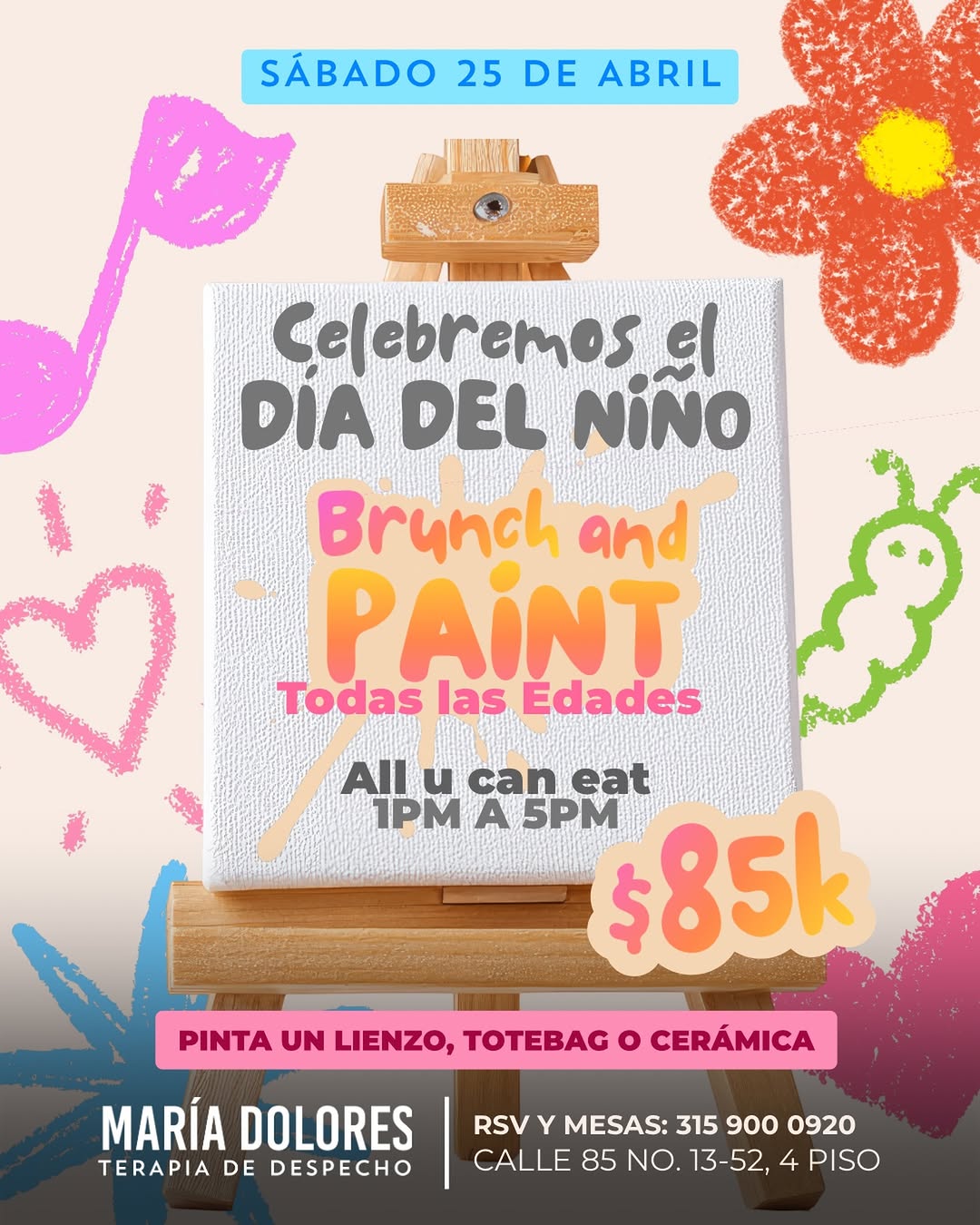 Celebremos el DÍA DEL NIÑO Brunch and PAINT es un plan familiar en formato brunch and paint en María Dolores en Bogotá, ideal para niños y adultos. Durante la tarde podrás disfrutar de una actividad creativa pintando lienzo, totebag o cerámica, mientras compartes un menú tipo all you can eat pensado también para los más pequeños. Un espacio relajado y divertido para celebrar el Día del Niño con arte, buena comida y un ambiente festivo en la ciudad.