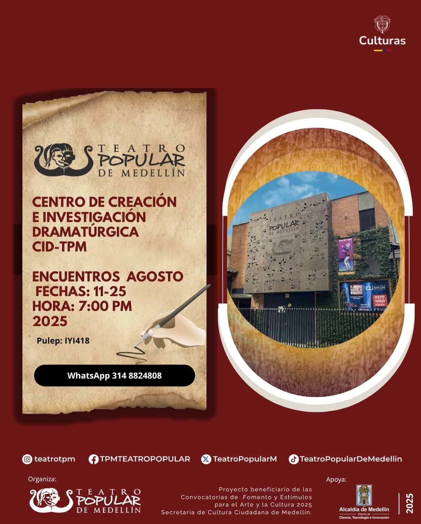 ¡Descubre el Centro de Creación e Investigación Dramatúrgica en Medellín! Desde los años 90, el TPM ha sido un referente en teatro, promoviendo la investigación, transmisión de teorías y técnicas de escritura teatral. Este espacio creativo ha enriquecido el proceso de escritura, impulsando programas para Jóvenes Creadores donde se aprende a crear con un propósito comunicativo claro. ¡Ven y sumérgete en el mundo del teatro en este centro único en la ciudad! No te pierdas la oportunidad de ser parte de esta experiencia enriquecedora. ¡Te esperamos el 25 de agosto a las 7:00 p.m. para vivir una noche llena de cultura y creatividad!