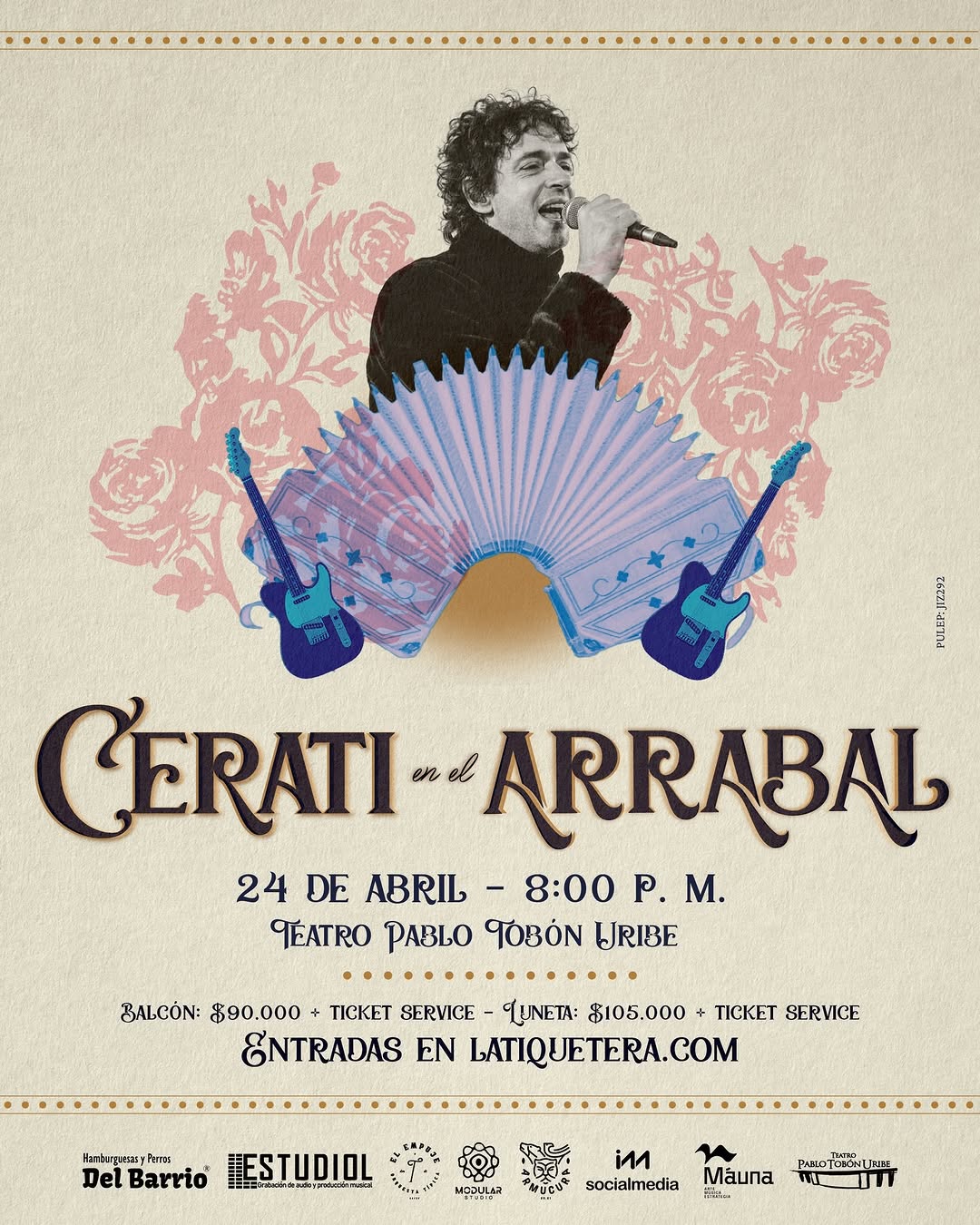 Cerati en el Arrabal es un concierto íntimo en Medellín que reimagina el repertorio de Gustavo Cerati desde el lenguaje del tango. En el escenario del Teatro Pablo Tobón Uribe, el público vivirá una experiencia musical emotiva y poderosa, donde los clásicos del artista argentino se transforman en versiones cargadas de sensibilidad y fuerza. Un plan ideal para amantes del rock en español, el tango y las propuestas sonoras innovadoras en la ciudad.