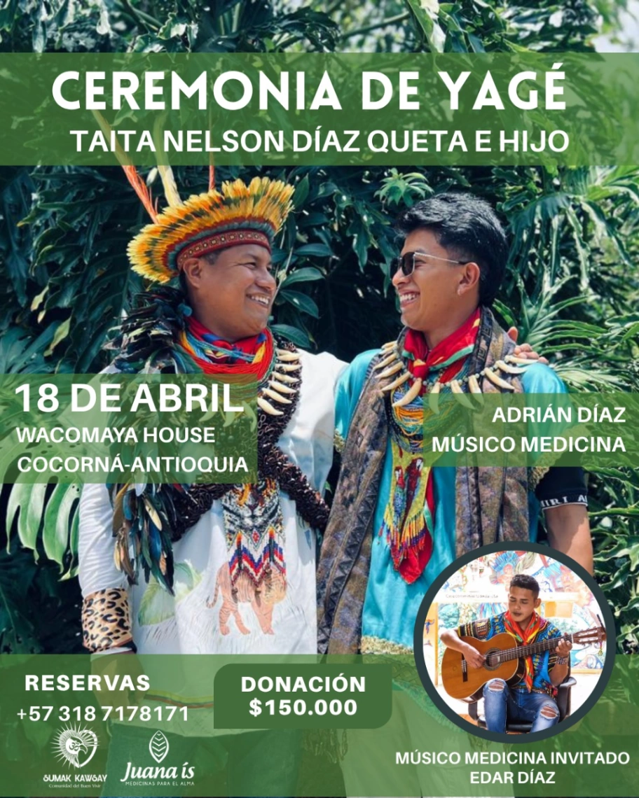 Nos estarán acompañando el Taita Nelson Díaz Queta y su hijo Adrian, indígenas cofanes del bajo Putumayo que nos vienen a traer el remedio del yagé como un legado que le entregaron sus mayores para quien lo necesite y sienta el llamado de conocer estas tradiciones.