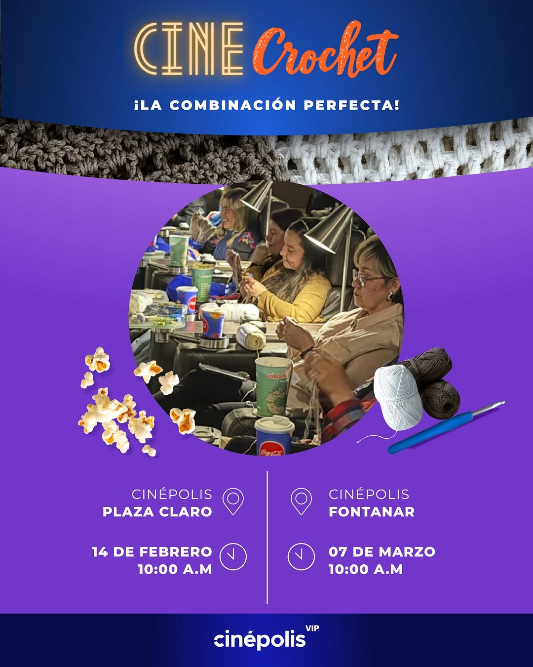 CINE Crochet es un plan diferente para disfrutar del cine mientras te dedicas al crochet en una experiencia tranquila y creativa. En esta actividad especial en Cinépolis Plaza Claro, en Bogotá, podrás compartir con otras personas aficionadas al tejido mientras ves una película en sala de cine. Es una propuesta ideal para celebrar en pareja, con amigos o en familia, combinando entretenimiento y manualidades en un ambiente cómodo y relajado.