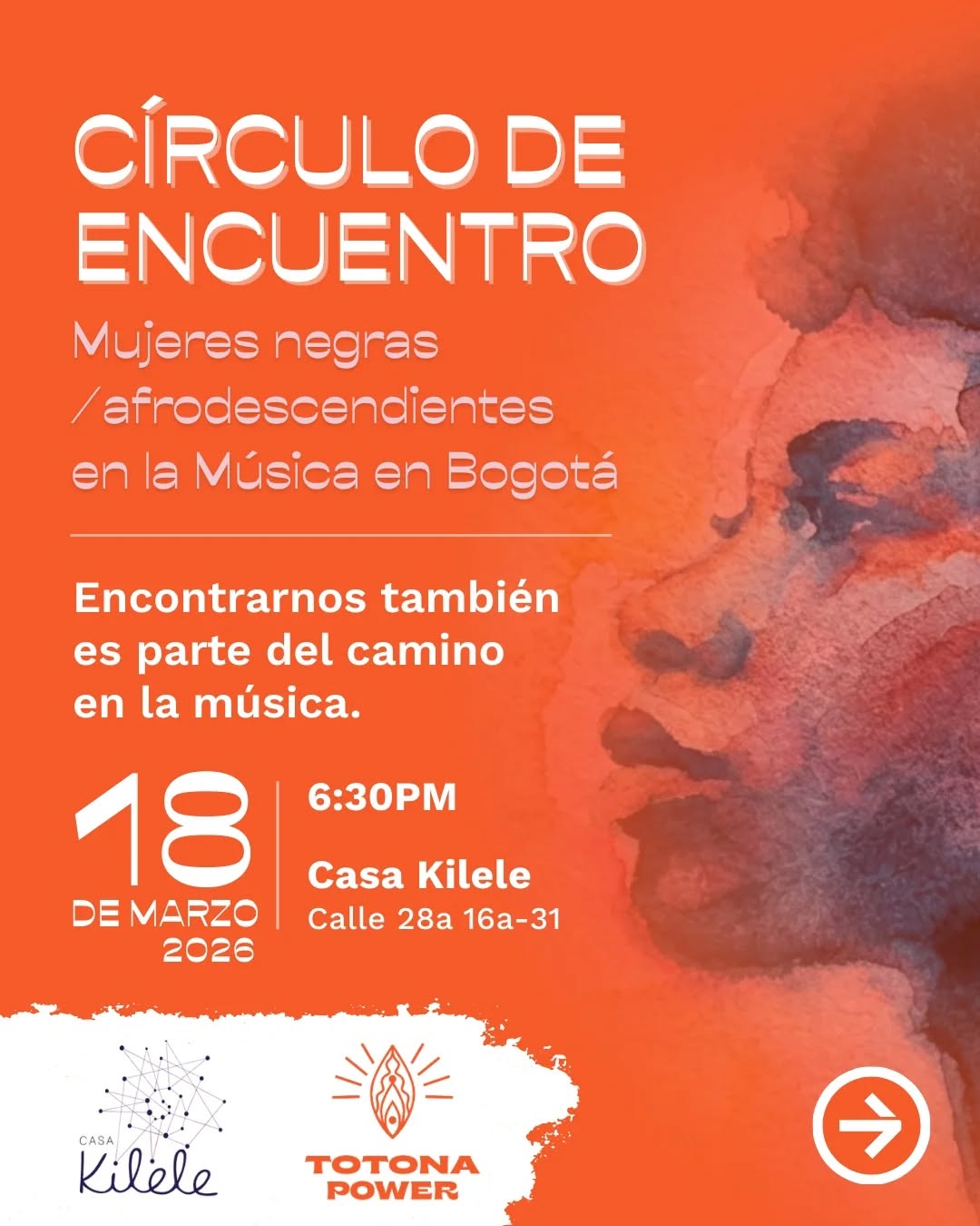 El Círculo de Encuentro Mujeres negras /afrodescendientes en la Música en Bogotá es un espacio íntimo de conversación y reconocimiento para mujeres negras y afrodescendientes que hacen parte del ecosistema musical de la ciudad. En Casa Kilele, en Bogotá, se compartirán hallazgos de una encuesta reciente, se tejerán redes de apoyo, cuidado y colaboración, y se fortalecerá la presencia de mujeres afro en la música local en un ambiente cercano y seguro.
