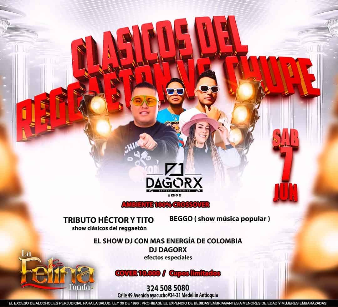 ¡Noche de Clásicos y Chupe en La Felina! ???? ???? Sábado 7 de junio ???? La Felina - Calle 49 Avenida Ayacucho #34-31 Medellín Antioquia. ???? Ambiente 100% crossover ???? En vivo: TRIBUTO A HÉCTOR Y TITO - Show con los mejores clásicos del reggaetón ???? El show DJ con más energía de Colombia: DJ DAGORX - efectos especiales que te harán vibrar ???? BEGGO en vivo - show de música popular que no te puedes perder