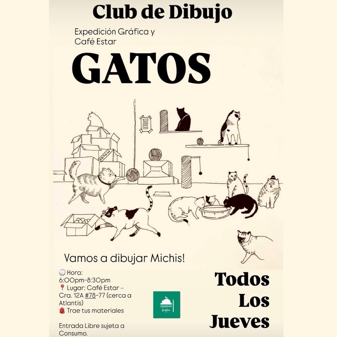 Club de Dibujo – GATOS es una sesión de dibujo en Café Estar en Bogotá donde personas de todos los niveles se reúnen a practicar ilustración de gatos y explorar gestos y movimiento felino. Es un espacio relajado para dibujar en comunidad, compartir procesos creativos y experimentar con tus materiales favoritos, organizado por Expedición Gráfica y aliados, ideal para quienes buscan un plan artístico y tranquilo entre semana.