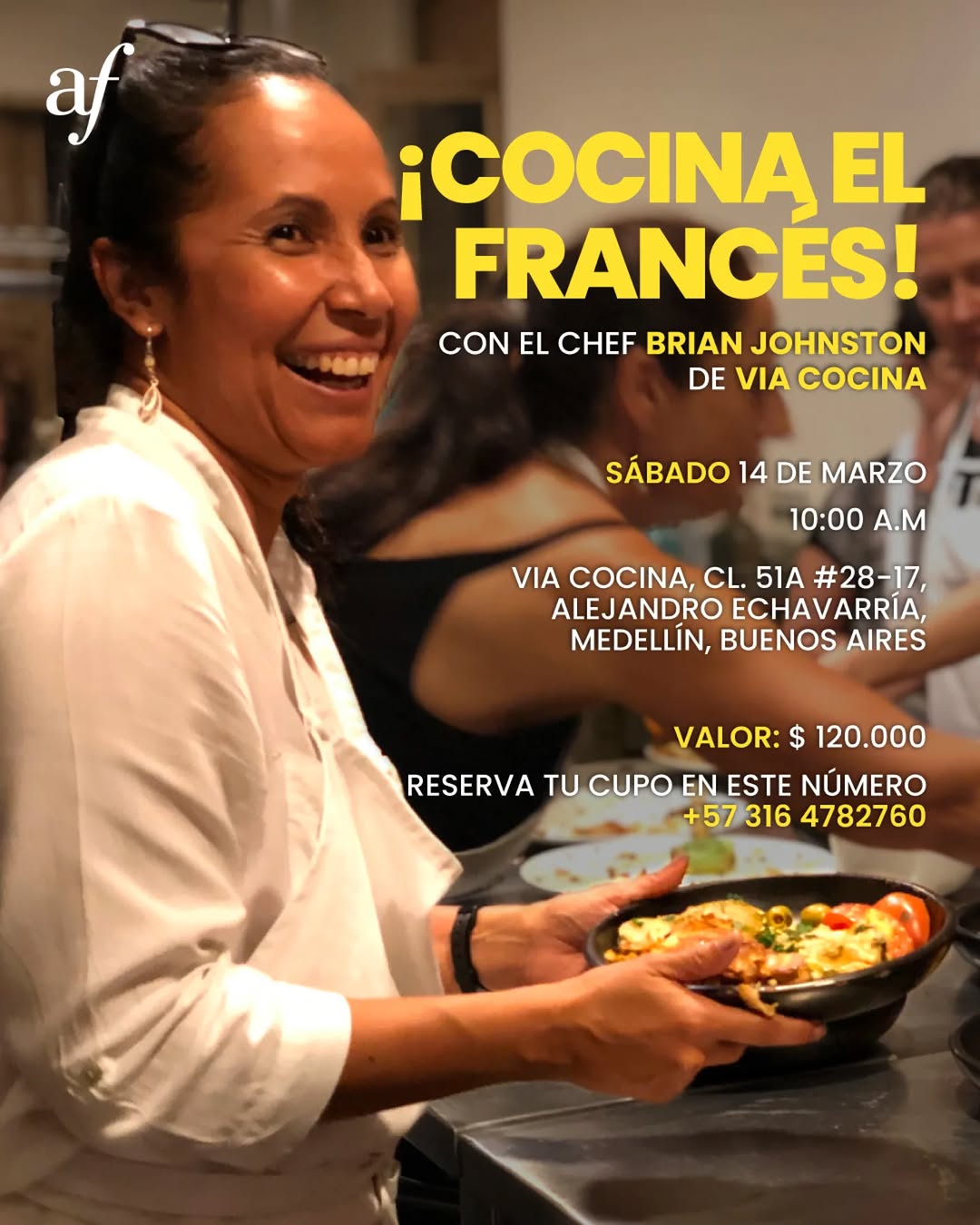 ¡COCINA EL FRANCÉS! es un taller de cocina en Medellín donde podrás acercarte a la gastronomía francesa de la mano del chef Brian Johnston y Via Cocina. Aprenderás a preparar recetas típicas, conocerás sabores y tradiciones de la cultura francófona y compartirás la degustación en un ambiente cercano y acogedor. Una experiencia ideal para quienes disfrutan la cocina, la cultura y la buena energía en la ciudad.