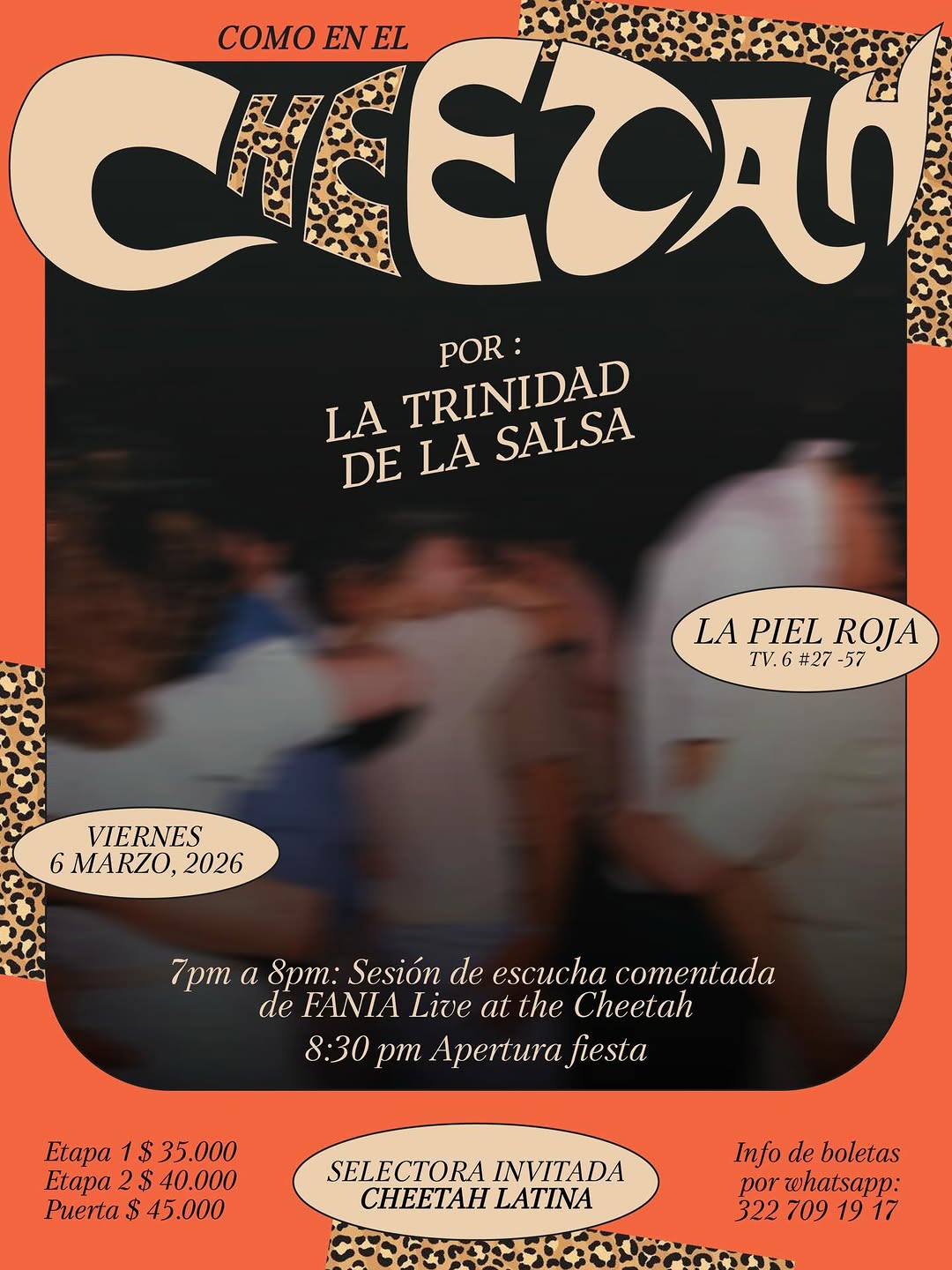 Como en el Cheetah es el primer evento del año de La Trinidad de la Salsa, una fiesta dedicada al sonido clásico de la FANIA en Bogotá. La noche arranca con una sesión de escucha comentada del mítico disco en vivo FANIA Live at the Cheetah y continúa con selección en vinilo a cargo de Cheetah Latina y La Trinidad de la Salsa. Un plan ideal para salseros que quieren bailar y aprender más sobre la historia de la salsa neoyorquina.