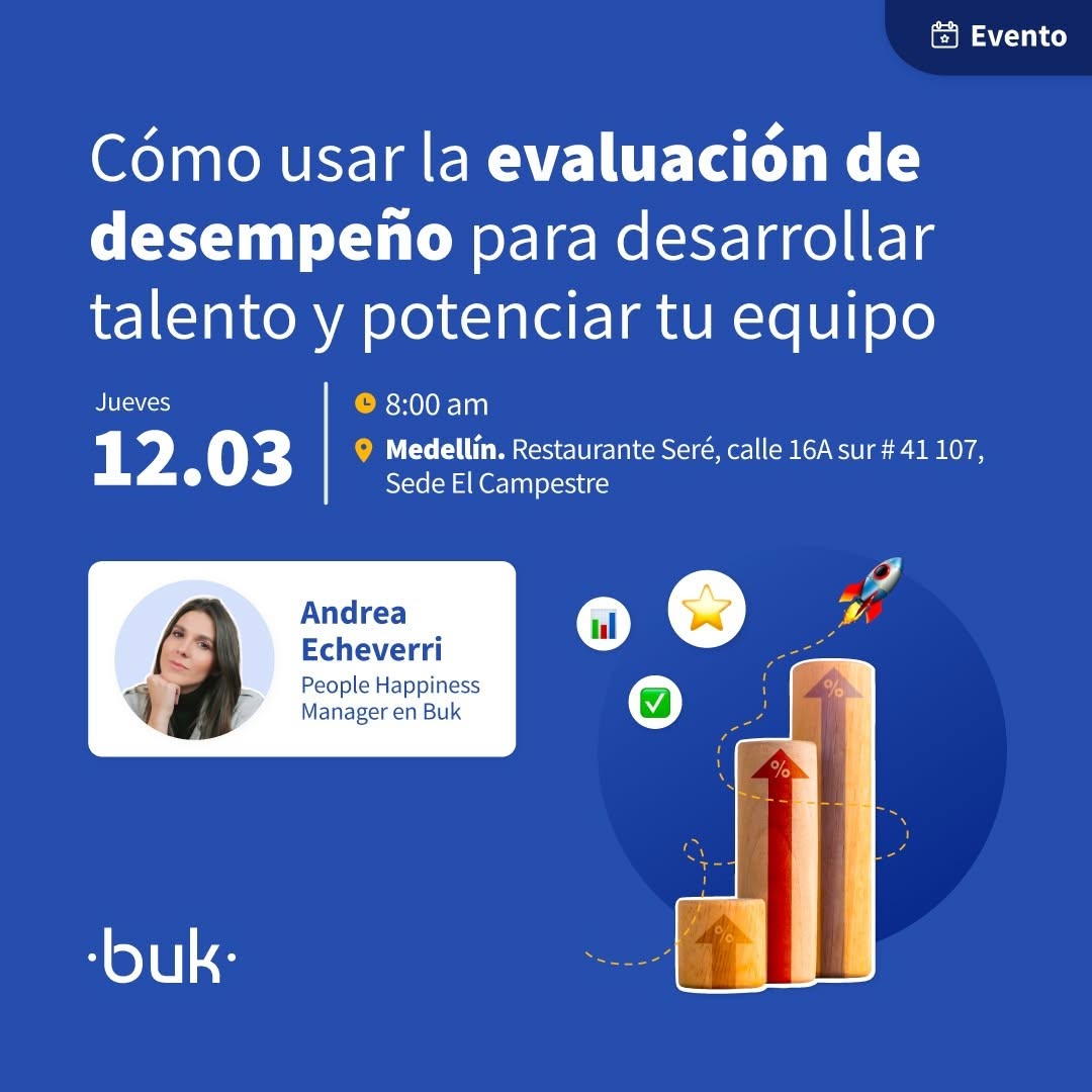 Cómo usar la evaluación de desempeño para desarrollar talento y potenciar tu equipo es un brunch exclusivo para líderes organizado por Buk en el restaurante Seré en Medellín. En esta actividad tipo charla y espacio formativo se compartirán herramientas prácticas para convertir las evaluaciones de desempeño en oportunidades reales de desarrollo de talento, fortalecimiento de equipos y construcción de ambientes laborales más felices.