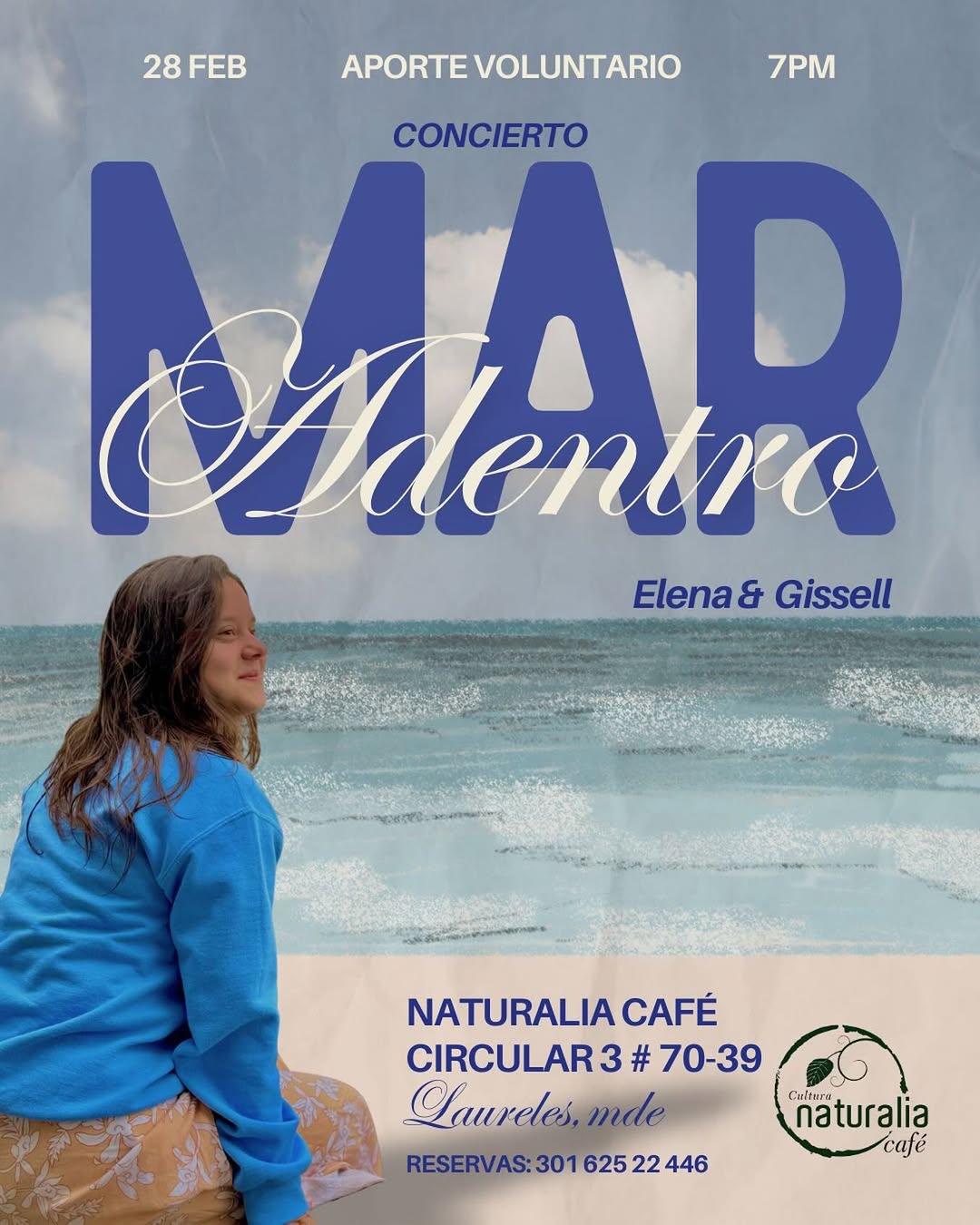 Concierto MAR Adentro es una presentación íntima en Naturalia Café, donde Elena y Gissell compartirán un repertorio pensado para disfrutar en vivo en Medellín. Será una noche musical cercana, ideal para quienes buscan un concierto acogedor con propuestas locales en un espacio cultural. La experiencia se centra en la conexión con las artistas y en un ambiente tranquilo para escuchar y dejarse llevar por la música.