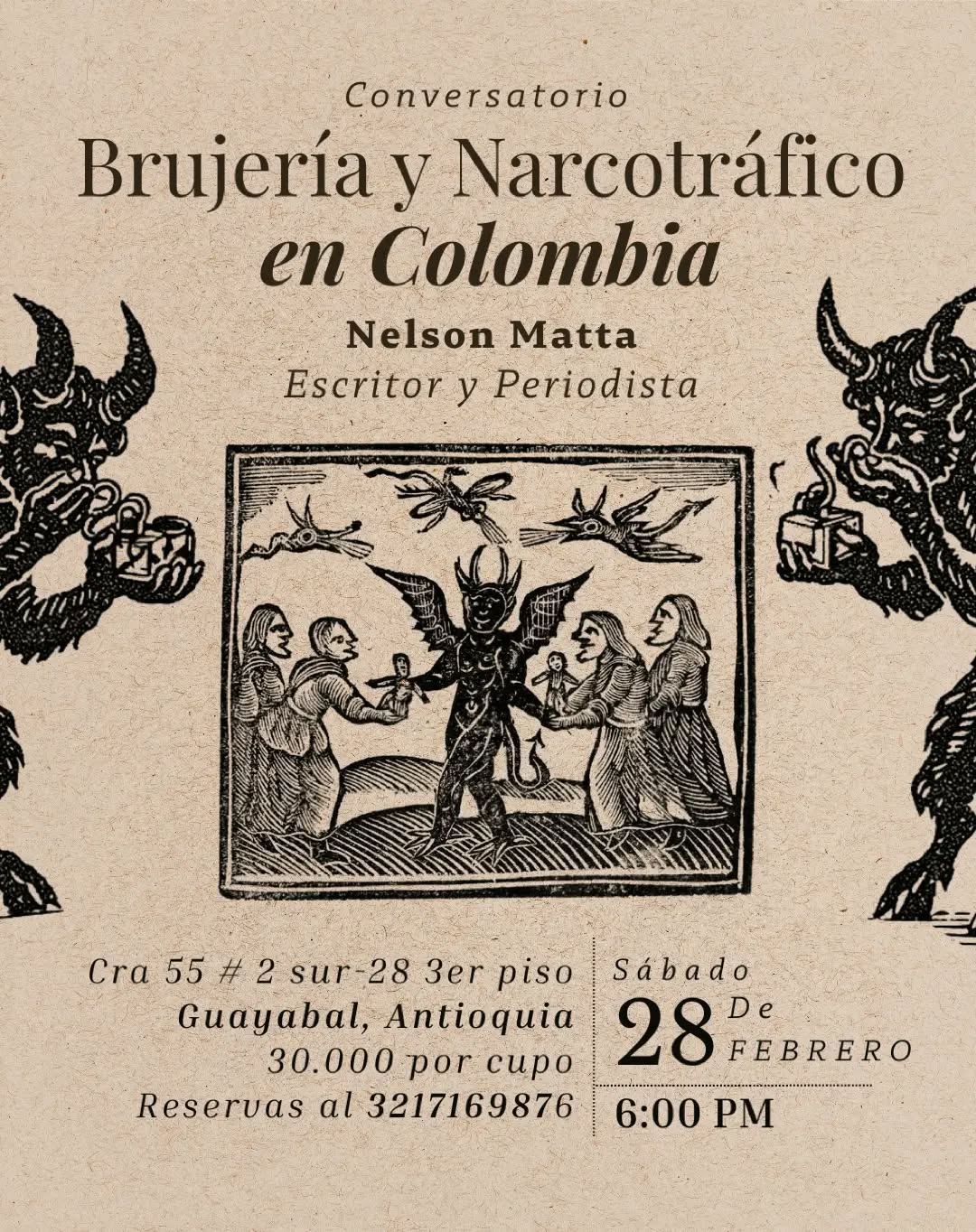 Conversatorio Brujería y Narcotráfico en Colombia es una charla en la Librería Musa, en Medellín, con el periodista y escritor Nelson Matta Colorado, autor de La Trilogía del Mal. El encuentro explora la relación entre brujería y narcotráfico en Colombia, los rituales y conjuros usados por estructuras criminales, así como casos reales y reflexiones sobre la maldad. Una actividad ideal para quienes se interesan por el periodismo de investigación, la violencia y la cultura del crimen organizado.