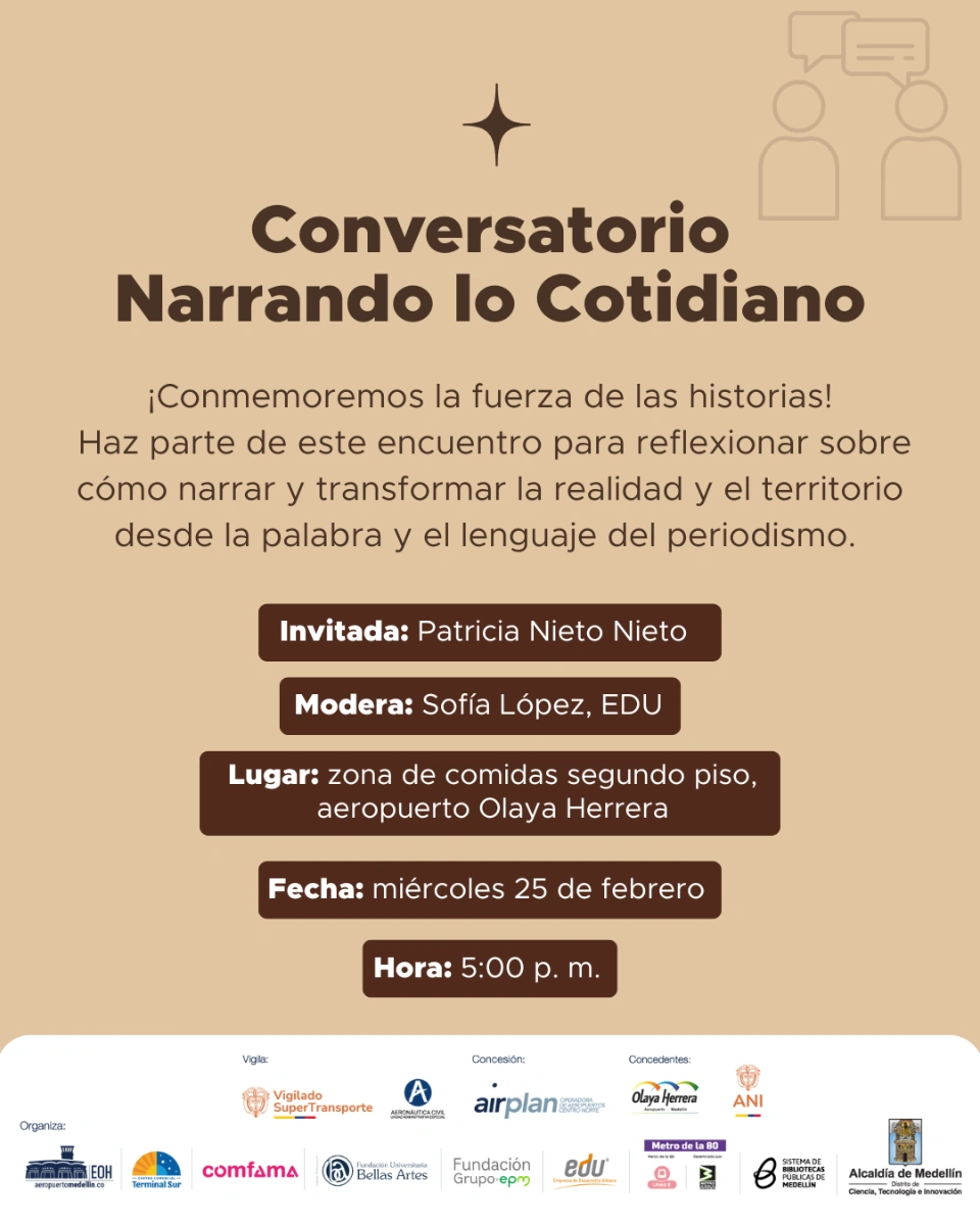 ¡En febrero conmemoremos la fuerza de las historias! Haz parte de este encuentro para reflexionar sobre cómo narrar y transformar la realidad y el territorio desde la palabra y el lenguaje del periodismo. Invitado: Patricia Nieto, periodista. Lugar: segundo piso (zona de comidas), aeropuerto Olaya Herrera.