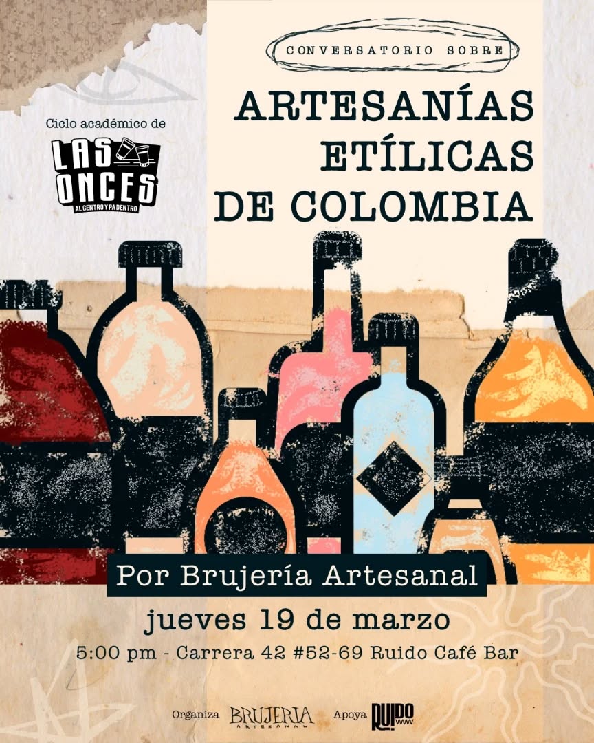 El conversatorio sobre Artesanías Etílicas de Colombia es un espacio creado por Brujería Artesanal y Ruido en el centro de Medellín para hablar de licores artesanales y su cultura. Será una charla cercana y relajada alrededor de la tradición de “tomarse las onces”, ideal para quienes quieren conocer más sobre bebidas etílicas artesanales colombianas y su trasfondo cultural en un ambiente íntimo y conversado.