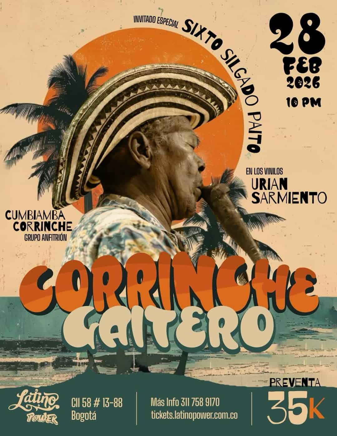 Corrinche Caitero es una noche de baile y tradición viva en Bogotá, donde la cumbia se reúne y el tambor llama. Con Cumbiamba Corrinche como grupo anfitrión y el invitado especial Sixto Silgado Paito, guardián del sonido ancestral, este concierto promete ser una experiencia inolvidable. Además, disfrutarás de la música de Urián Sarmiento en los vinilos. Ven a bailar donde la cumbia es sagrada en Latino Power.
