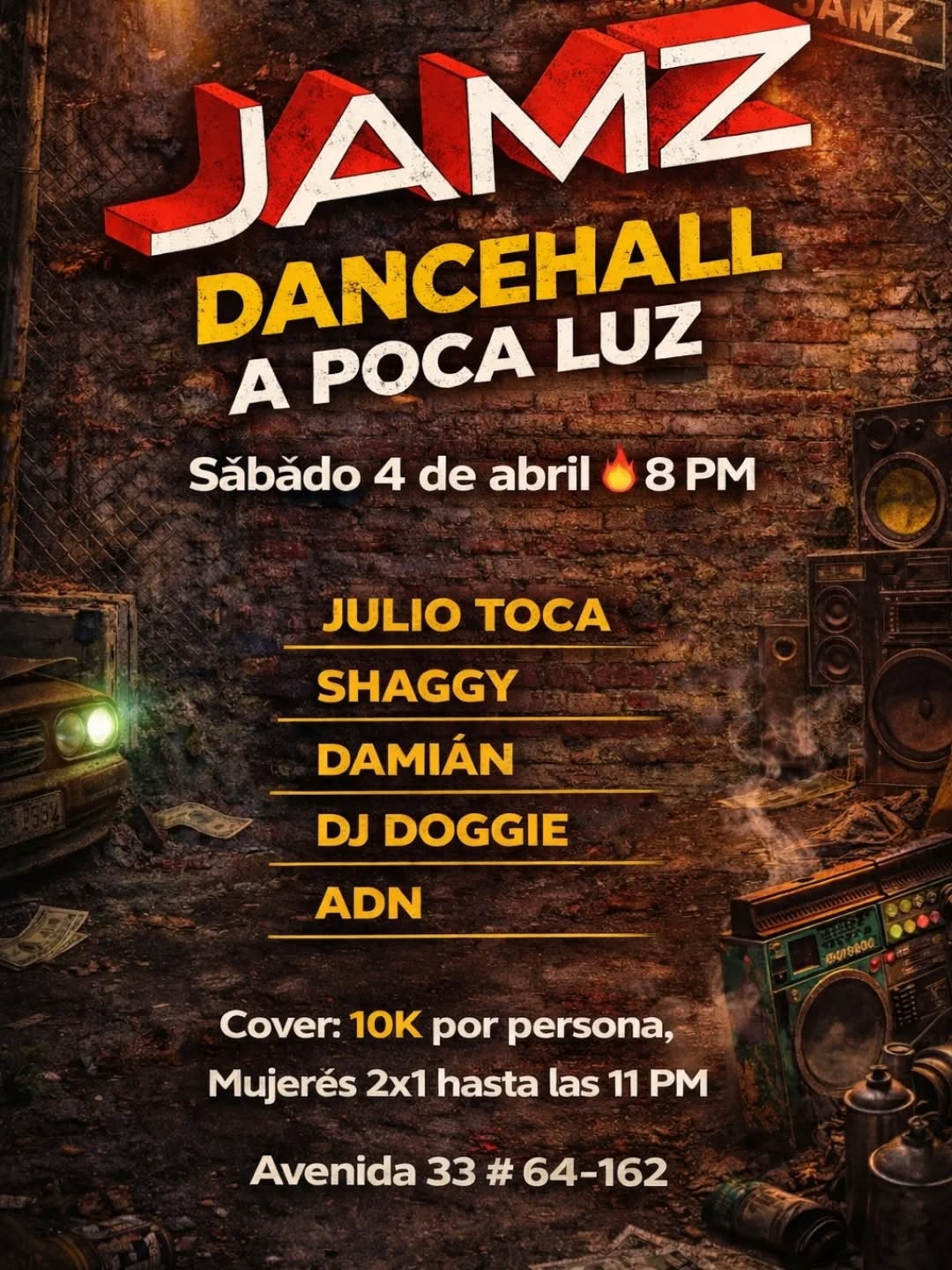 JAMZ DANCEHALL A POCA LUZ es una noche dedicada al dancehall más intenso, con luces bajas, perreo pegado y una atmósfera caliente ideal para quienes disfrutan bailar sin timidez. Con DJs como Julio Toca, Shaggy, Damián, DJ Doggie y ADN, este evento promete una fiesta urbana cargada de energía, promos especiales para mujeres y una pista encendida en Medellín.