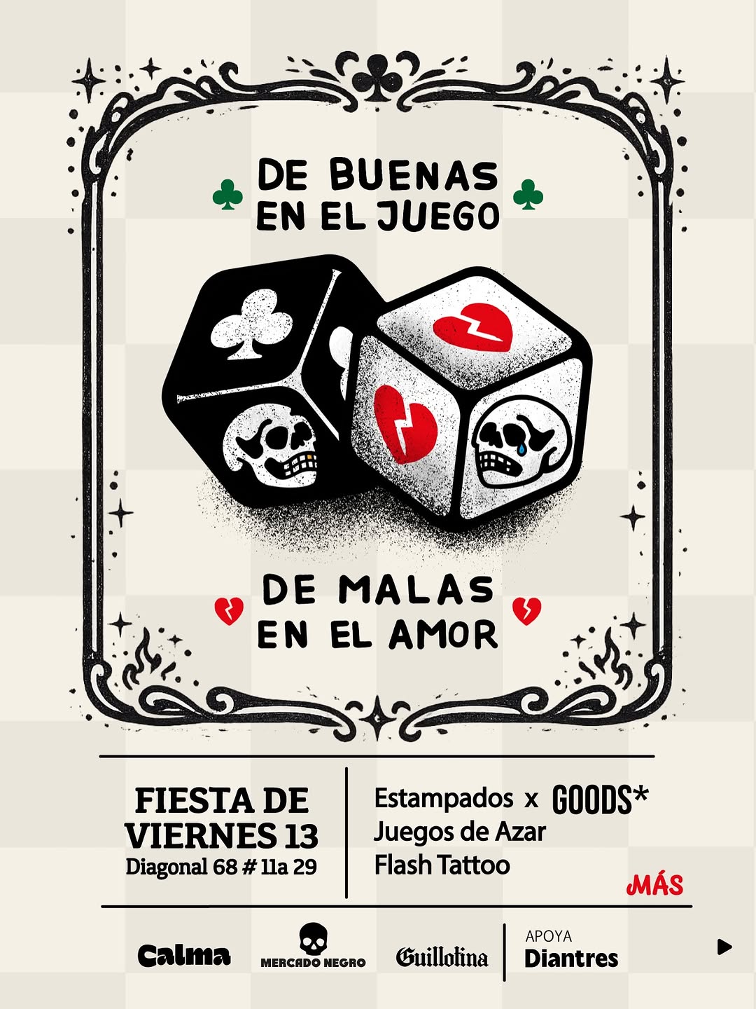 De Buenas en el Juego, De Malas en el Amor es una fiesta temática de Viernes 13 organizada por Diantres en Bogotá, con el apoyo de Calma, Mercado Negro y Guillotina. Será una noche para disfrutar de juegos de azar, sesiones de flash tattoo y estampados en vivo a cargo de GOODS, ideal para quienes buscan un plan diferente, alternativo y cargado de buena energía, arte y suerte en el juego, aunque no tanto en el amor.