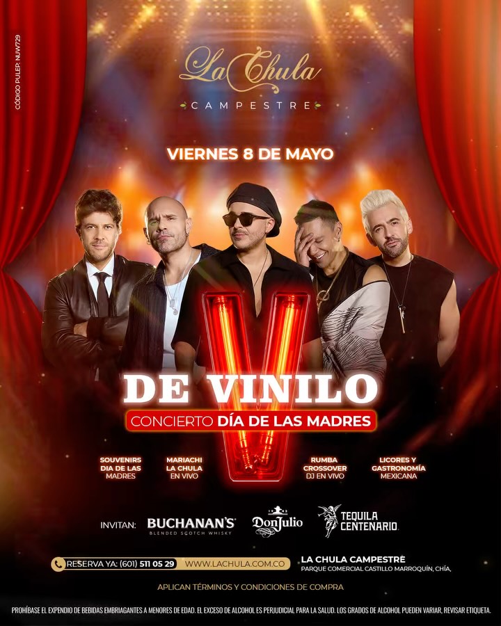 De Vinilo – Concierto Día de las Madres es una noche especial en La Chula Campestre, en Chía, pensada para celebrar a mamá con música en vivo y ambiente festivo. El evento combina concierto de De Vinilo, mariachi en vivo, rumba crossover con DJ, además de licores y gastronomía mexicana. Una experiencia íntima y emotiva para cantar grandes éxitos y disfrutar en familia en un plan cultural y musical único en la ciudad.