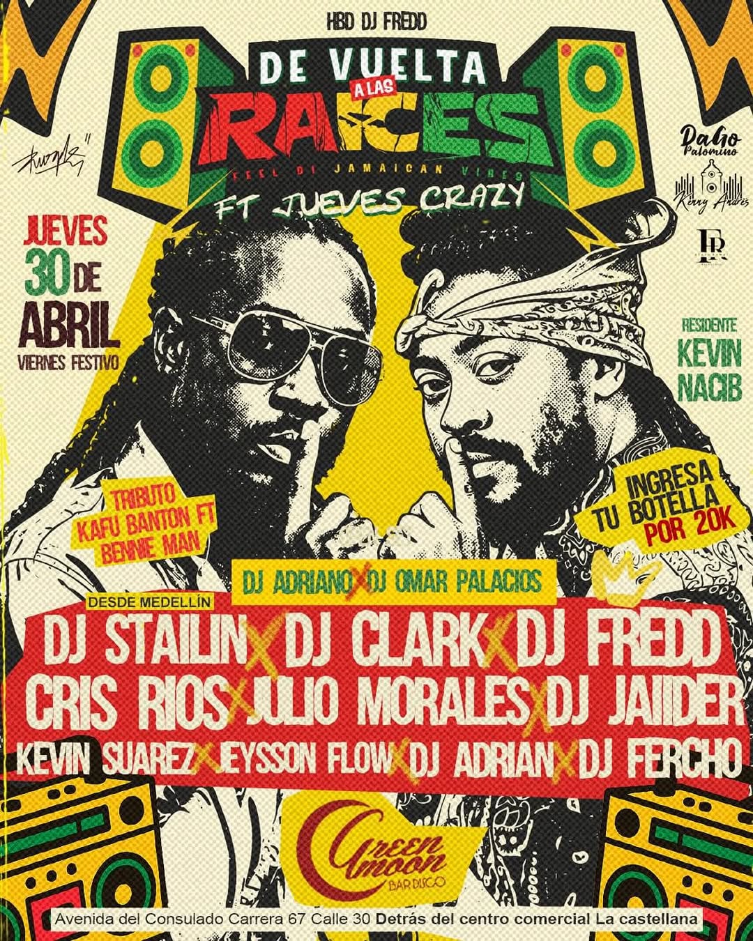 DE VUELTA A LAS RAÍCES es una fiesta de dancehall y ritmos jamaicanos que reúne a varios DJs y artistas en Green Moon Bar Buco en Medellín. Será una noche dedicada a los amantes del real dancehall, con selecciones cargadas de vibra caribeña y energía urbana. Un plan ideal para celebrar, bailar sin parar y disfrutar de una experiencia auténtica de clubbing con sabor jamaicano en la ciudad.