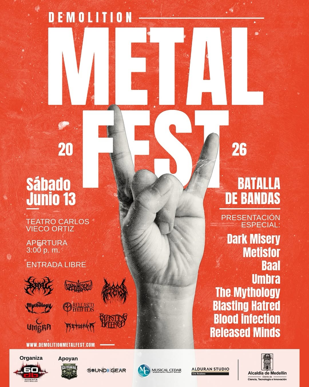 Demolition Metal Fest 2026 llega al Teatro Carlos Vieco Ortiz en Medellín con una batalla de bandas de metal local. Dark Misery, Metisfor, Baal, Umbra, The Mythology, Blasting Hatred, Blood Infection y Released Minds se enfrentan en tarima en un festival de metal intenso, lleno de pogo y energía. Un parche ideal para quienes buscan apoyar la escena metalera de la ciudad y vivir una tarde de riffs pesados y ambiente underground.
