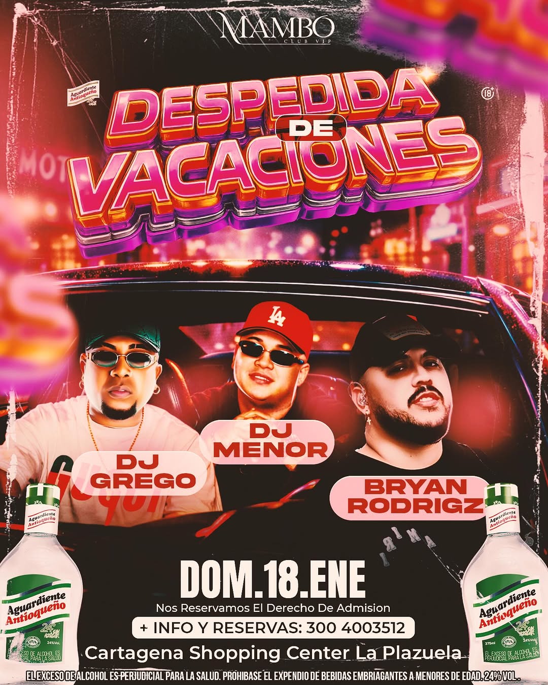 Este domingo, ven a despedir las vacaciones en la Discoteca Mambo Club VIP. Disfruta de una rumba nocturna con música latina y urbana a cargo de DJ Grego, DJ Menor y Bryan Rodrigz. No te pierdas esta gran fiesta en Cartagena. Recuerda, la entrada es gratis hasta las 11:00 pm. ¡Te esperamos!